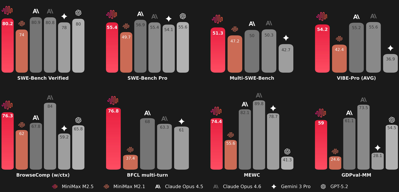 Today we're introducing our latest model, **MiniMax-M2.5**. Extensively trained with reinforcement learning in hundreds of thousands of complex real-world environments, M2.5 is **SOTA in coding, agentic tool use and search, office work, and a range of other economically valuable tasks**, boasting scores of **80.2% in SWE-Bench Verified, 51.3% in Multi-SWE-Bench, and 76.3% in BrowseComp** (with context management). Trained to reason efficiently and decompose tasks optimally, M2.5 exhibits tremendous speed in performing complicated agentic tasks, completing the SWE-Bench Verified evaluation **37% faster** than M2.1, matching the speed of **Claude Opus 4.6**. M2.5 is the first frontier model where users do not need to worry about cost, delivering on the promise of intelligence too cheap to meter. **It costs just $1 to run the model continuously for an hour at a rate of 100 tokens per second.** At 50 tokens per second, the cost drops to $0.30. We hope that the speed and cost effectiveness of M2.5 enable innovative new agentic applications. ## Coding In programming evaluations, MiniMax-M2.5 saw substantial improvements compared to previous generations, reaching SOTA levels. The performance of M2.5 in multilingual tasks is especially pronounced.