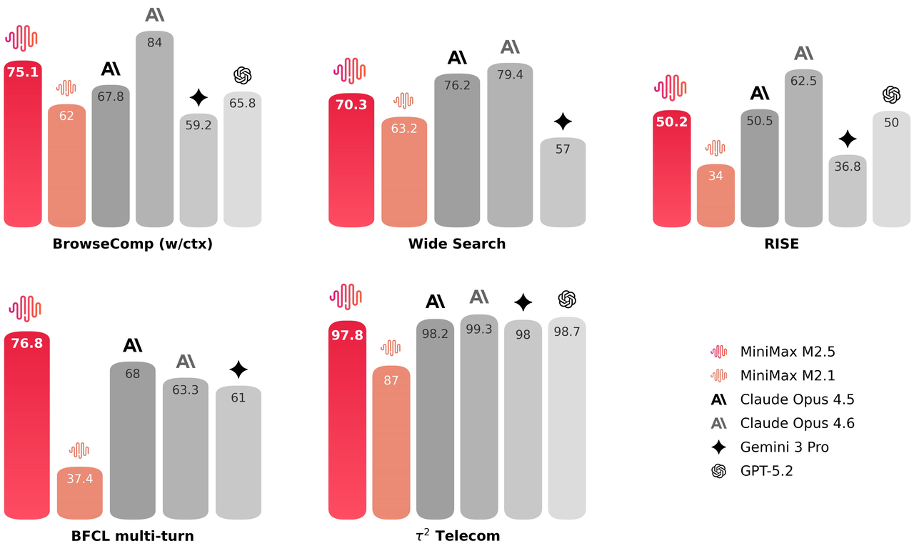 We focused on the model's ability to generalize across out-of-distribution harnesses. We tested performance on the SWE-Bench Verified evaluation set using different coding agent harnesses. - On Droid: 79.7(M2.5) > 78.9(Opus 4.6) - On OpenCode: 76.1(M2.5) > 75.9(Opus 4.6) ## Search and Tool calling