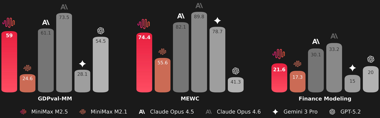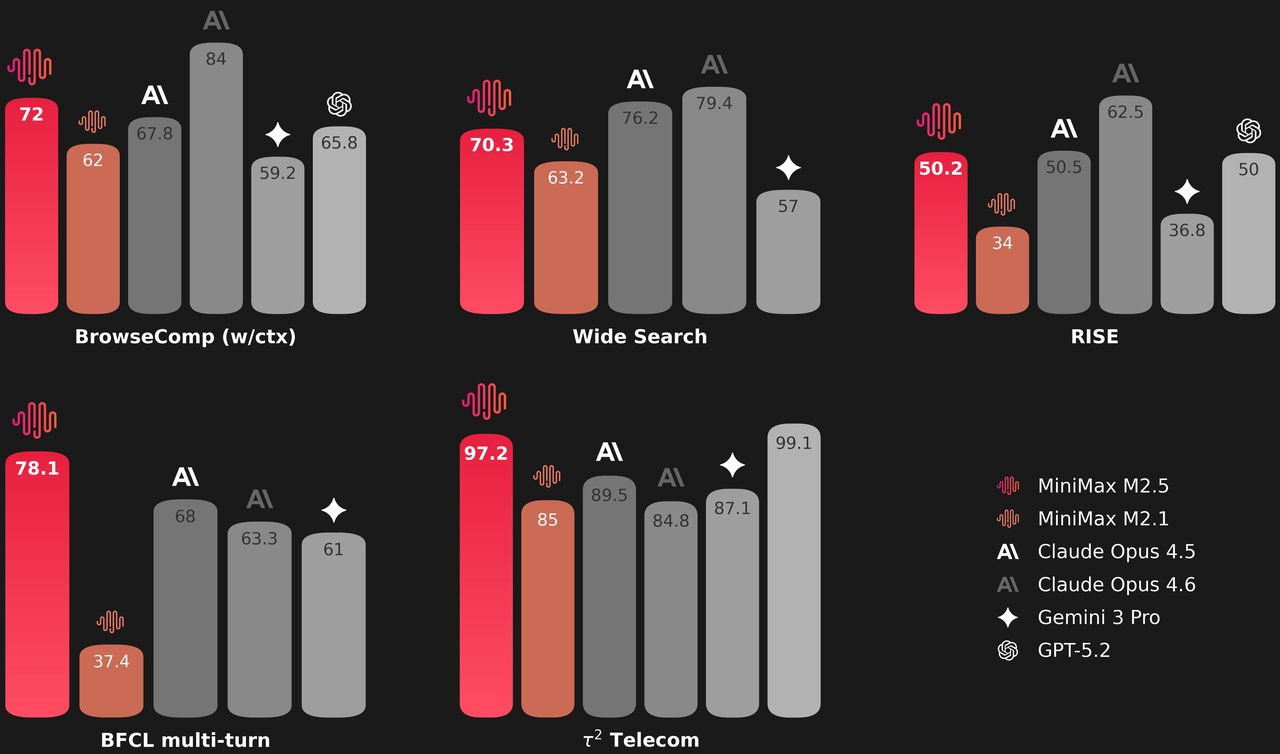 Effective tool calling and search are prerequisites for a model's ability to autonomously handle more complex tasks. In evaluations on benchmarks such as BrowseComp and Wide Search, M2.5 achieved industry-leading performance. At the same time, the model's generalization has also improved β€” M2.5 demonstrates more stable performance when facing unfamiliar scaffolding environments. In research tasks performed by professional human experts, using a search engine is only a small part of the process; most of the work involves deep exploration across information-dense webpages. To address this, we built RISE (Realistic Interactive Search Evaluation) to measure a model's search capabilities on real-world professional tasks. The results show that M2.5 excels at expert-level search tasks in real-world settings. Compared to its predecessors, M2.5 also demonstrates much better decision-making when handling agentic tasks: it has learned to solve problems with more precise search rounds and better token efficiency. For example, across multiple agentic tasks including BrowseComp, Wide Search, and RISE, M2.5 achieved better results with fewer rounds, using approximately 20% fewer rounds compared to M2.1. This indicates that the model is no longer just getting the answer right, but is also reasoning towards results in more efficient paths. ## Office work M2.5 was trained to produce truly deliverable outputs in office scenarios. To this end, we engaged in thorough collaboration with senior professionals in fields such as finance, law, and social sciences. They designed requirements, provided feedback, participated in defining standards, and directly contributed to data construction, bringing the tacit knowledge of their industries into the model's training pipeline. Based on this foundation, M2.5 has achieved significant capability improvements in high-value workspace scenarios such as Word, PowerPoint, and Excel financial modeling. On the evaluation side, we built an internal Cowork Agent evaluation framework (GDPval-MM) that assesses both the quality of the deliverable and the professionalism of the agent's trajectory through pairwise comparisons, while also monitoring token costs across the entire workflow to estimate the model's real-world productivity gains. In comparisons against other mainstream models, it achieved an average win rate of 59.0%.