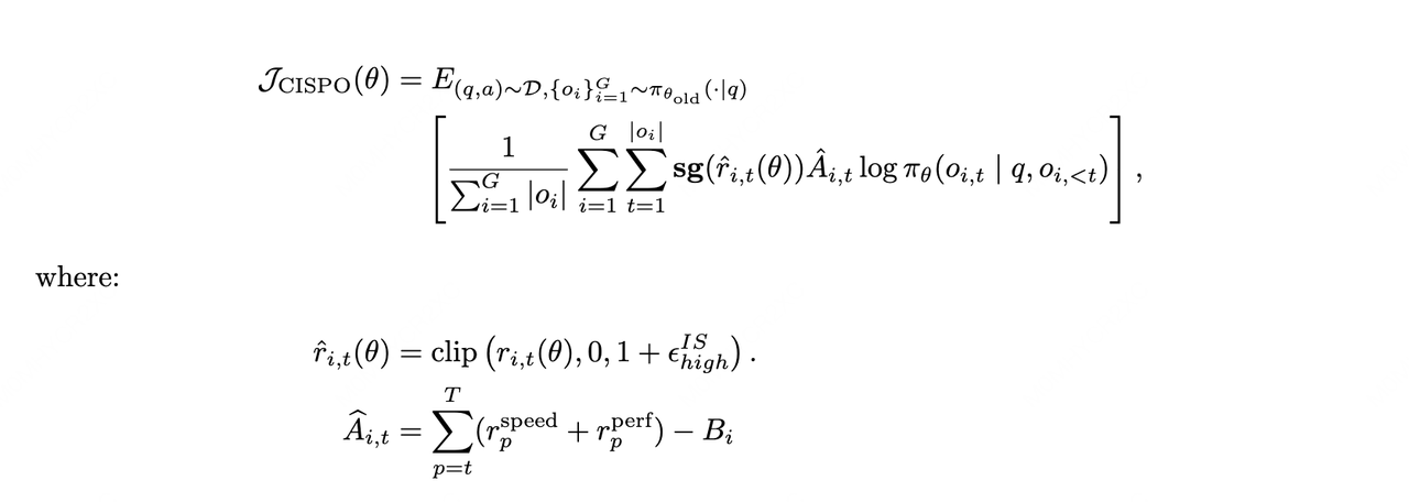 ### Agentic RL Algorithm and Reward Design On the algorithm side, we continued using the CISPO algorithm we proposed at the beginning of last year to ensure the stability of MoE models during large-scale training. To address the credit assignment challenge posed by long contexts in agent rollouts, we introduced a process reward mechanism for end-to-end monitoring of generation quality. Furthermore, to deeply align with user experience, we evaluated task completion time through agent trajectories, achieving an optimal trade-off between model intelligence and response speed.
