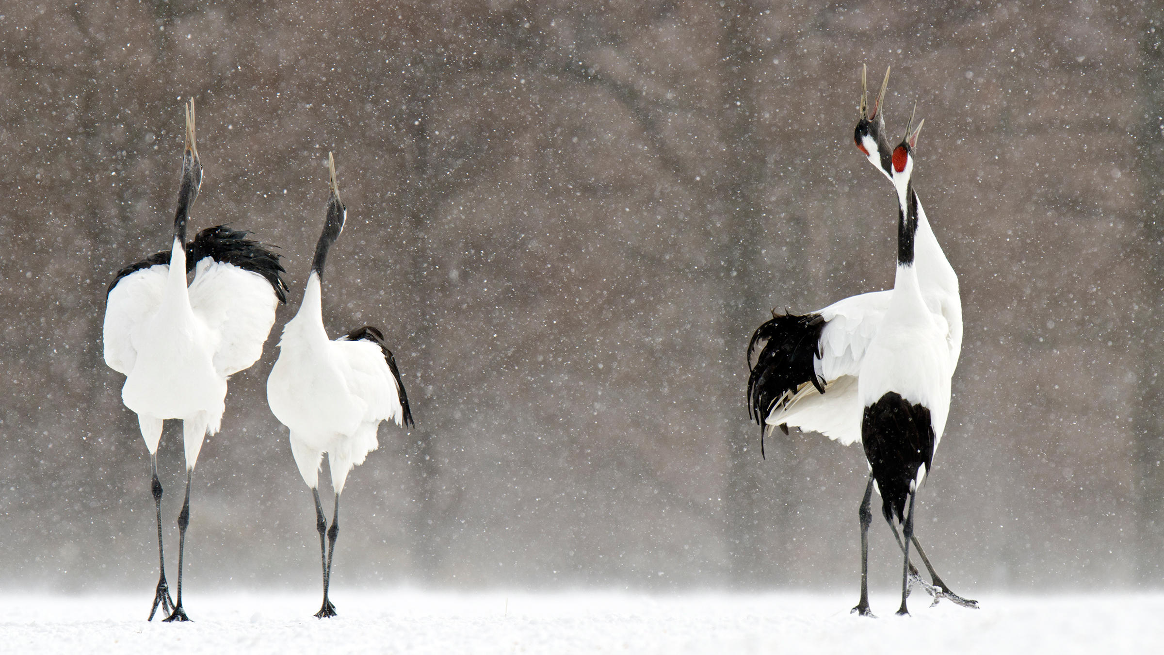 Three orange tents in snowy mountain landscape.