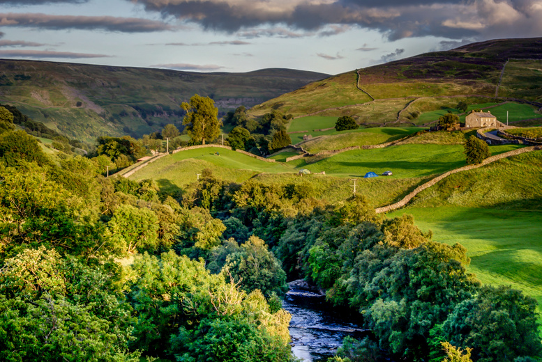 Rustic farmhouse, lush greenery, winding path, rural landscape.