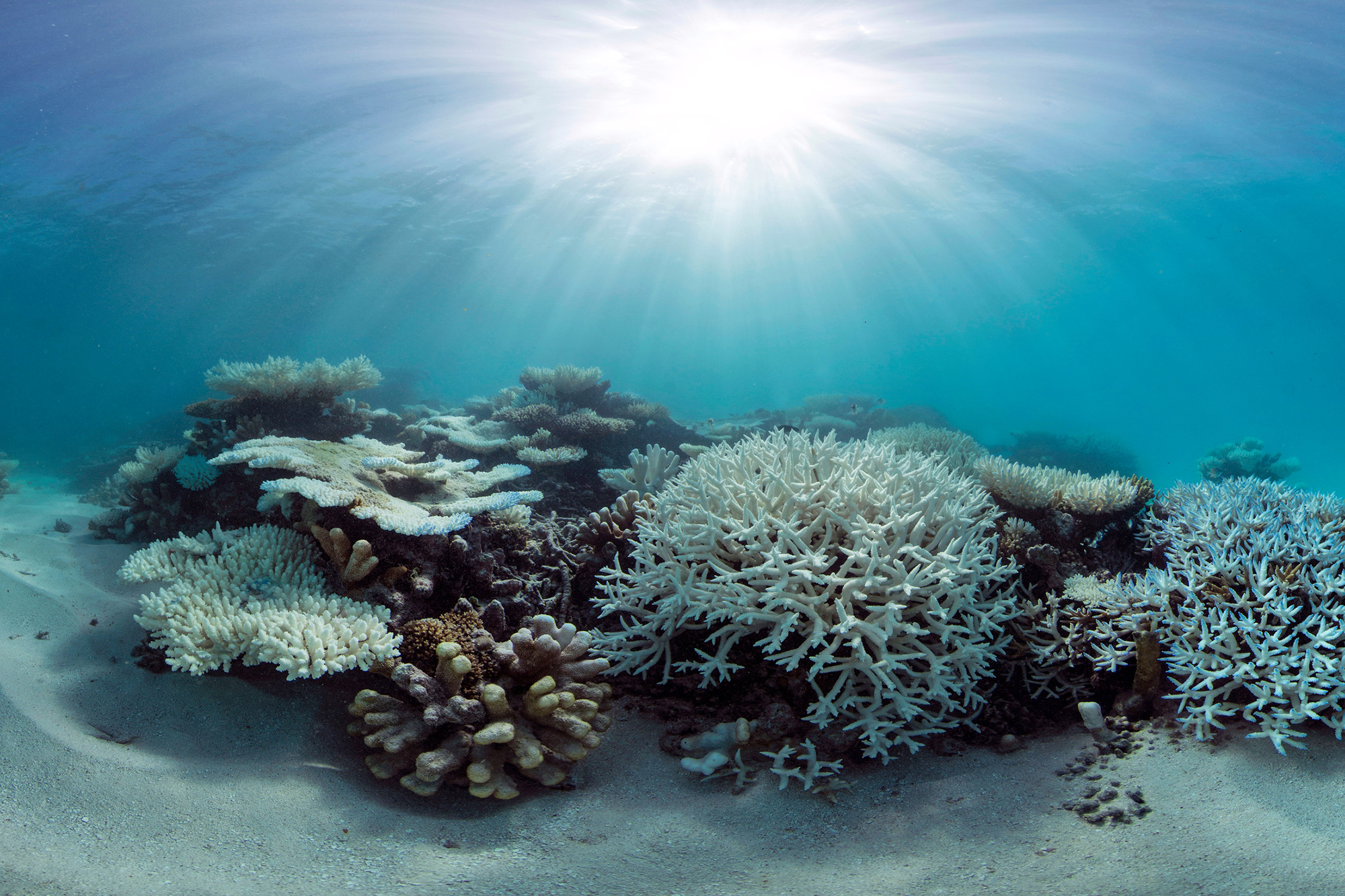 Underwater coral reef with sun rays filtering through clear blue water.