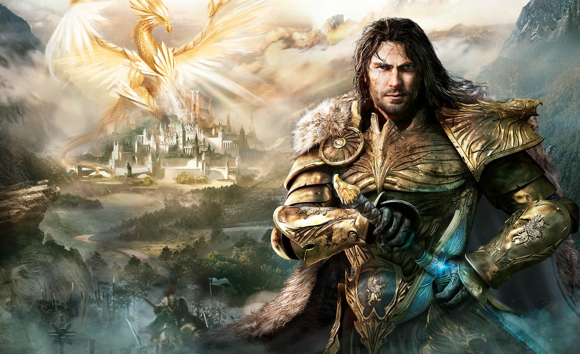 Warrior in golden armor with sword, standing in front of a castle and mountains.