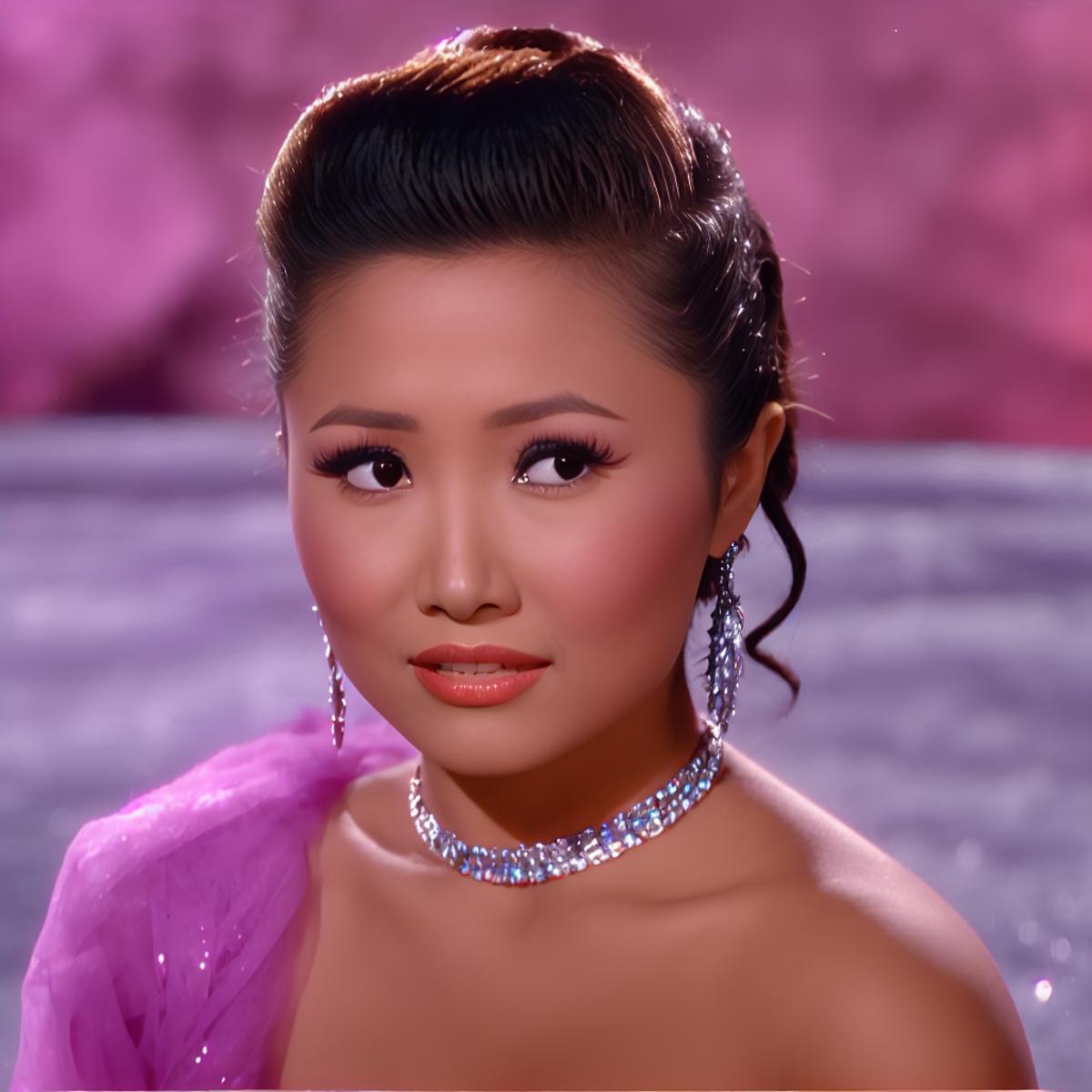 tchnclr style, a closeup portrait of Brenda Song, sad happy expression, wearing a glittery dress, with a blue velvety background, in the 1950s, tchnclr style