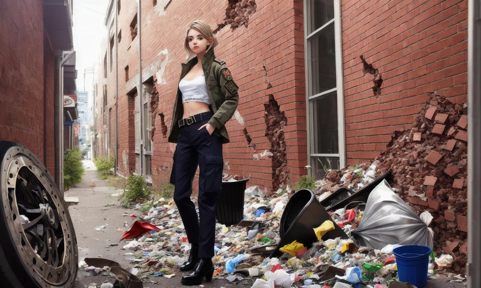 solo girl, photo (masterpiece:1.1),(priceless work of art:1.1),(ultrarealistic:1.2), (cute:1.1) pale, beautiful girl, gorgeous female, solo focus, (Ashley Benson), silver hair, (medium breasts:1.1),(detailed body:1.0)detailed face,(detailed eyes:0.8)(heterochromia),pointy elf ears, ((freckles:0.9)), (naughty smile:0.7), (focus:1.1), professional photograph, anime aesthetic, inked lines, tattoos, fingerless gloves, crop top, cargo pants, military long jacket, belts, mechanical parts, crumbling wall, brick wall, alleyway, trash