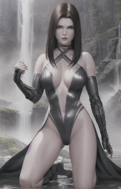highly detailed, artstation, smooth, sharp focus, (best quality:1.05), (ultra-detailed:1.05), (high resolution:1.05), (an extremely delicate and beautiful:1.1025), amazing, (extremely detailed 8k unity cg wallpaper:1.1576), (extremely detailed face:1.1025), realistic eyes, 1girl, (Anna-Marie Darkholme from X-Men:1.2), (X-Men Evolution:1.2), X-Men Rogue, gothic makeup, goth, choker, pale skin, X-Men, Marvel, superhero, green eyes, brown hair, (white bangs:1.2), layered bob hairstyle, short hair, (eyelashes:1.2-4),pelvic curtain, water between thighs, naked, nude, nipples, wet skin, wet hair, wet, athletic body, full body, detailed toes, water, kneeling, explicit, diffused lighting, seductive, waterfall, misty, floating light particles