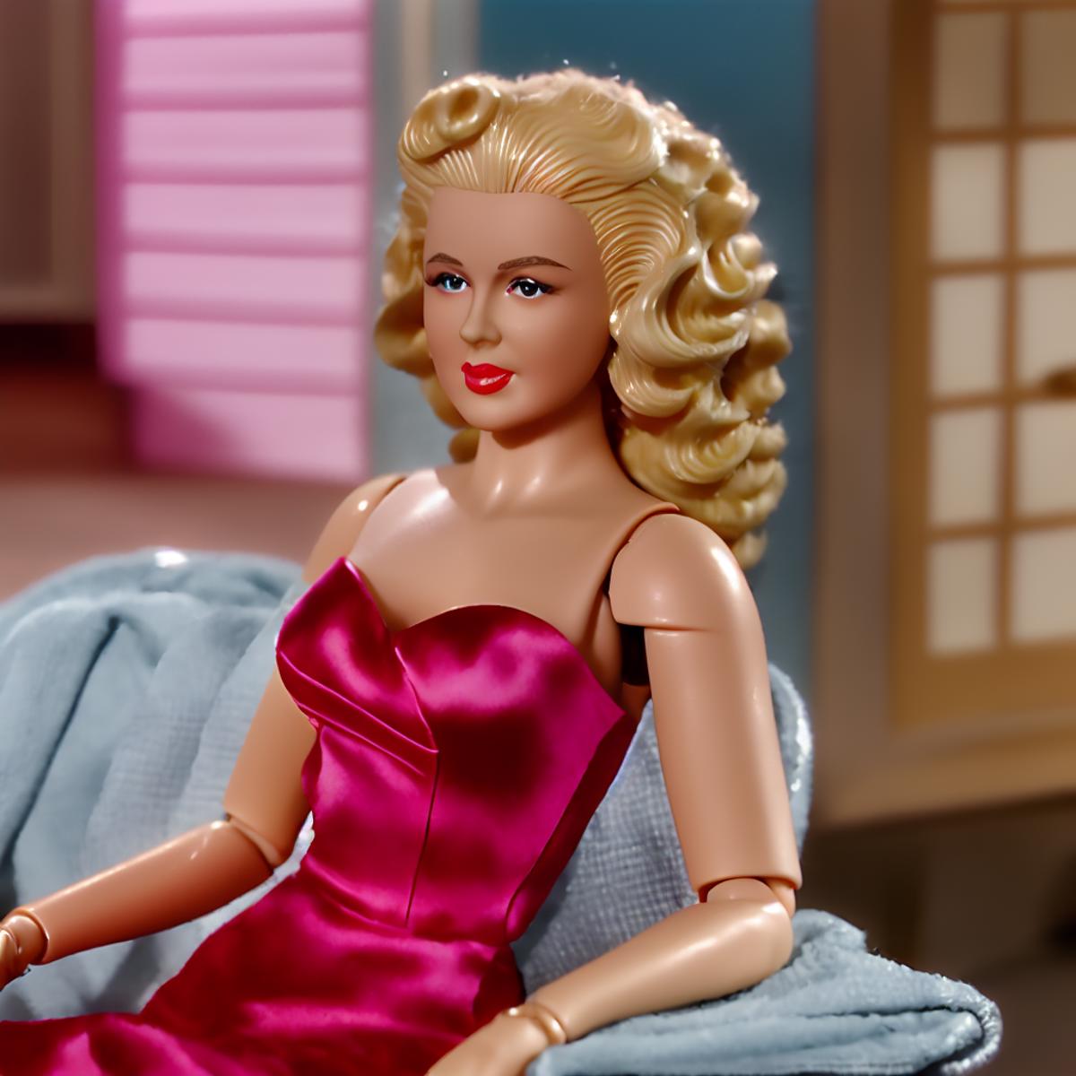 an (female action figure:1.2) of a 40 year old woman with curly blonde hair, , wearing a satin dress and red lipstick, in a miniature model of a home, in the 1950s