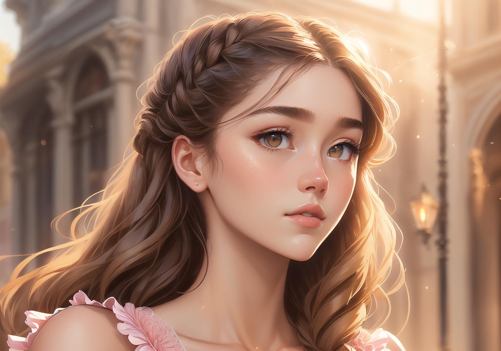 Masterpiece, best quality, realistic, 1girl, (face focus:1.4), red (french braid:1.2), (pink sundress:1.3), (intricate lace:1.1), art by Style-Empire, art by Style-Empire, small breasts, cleavage, (from below:1.2), (cowboy shot:1.3), sunny backlighting, (medieval tavern:0.9), art by Style-Tavern, (bloom:1.1), (light sparkles:1.2), (chromatic aberration:1.0), (shallow depth of field:1.3), (lens flare:1.2), looking at viewer, (dutch angle:1.0), perfect feminine face, (volumetric lighting:1.0), (detailed:1.0), (photorealistic:1.0), digital painting, (sharp:1), (realistic:1.0), cleavage