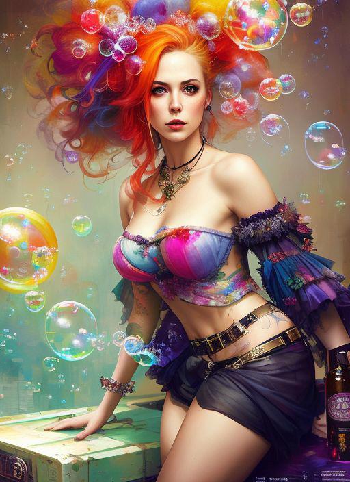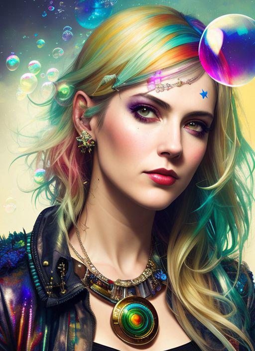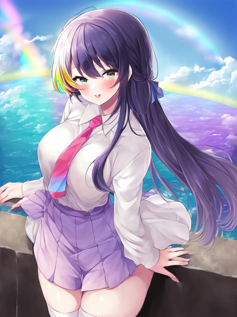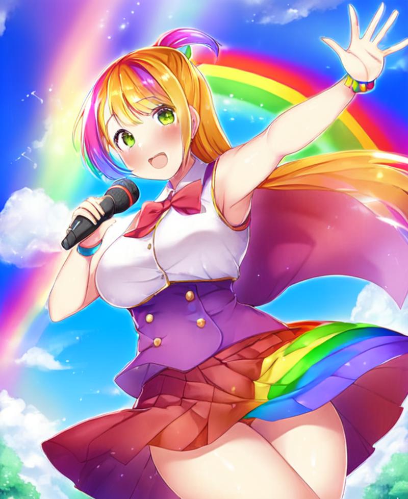 1girl, rainbow, waving, by b-ginga, realistic,anatomy, rainbow, breasts, rainbow, skirt, microphone
