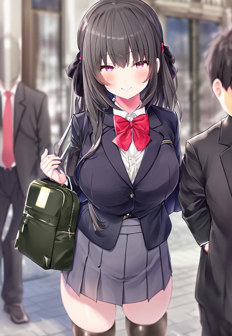 by mitsudoue, 1girl, outside, city streets, waist, upper body, realistic, breasts, portrait, smile, blazer uniform, dress shirt, pleated skirt, schoolbag, hair bow, black bow