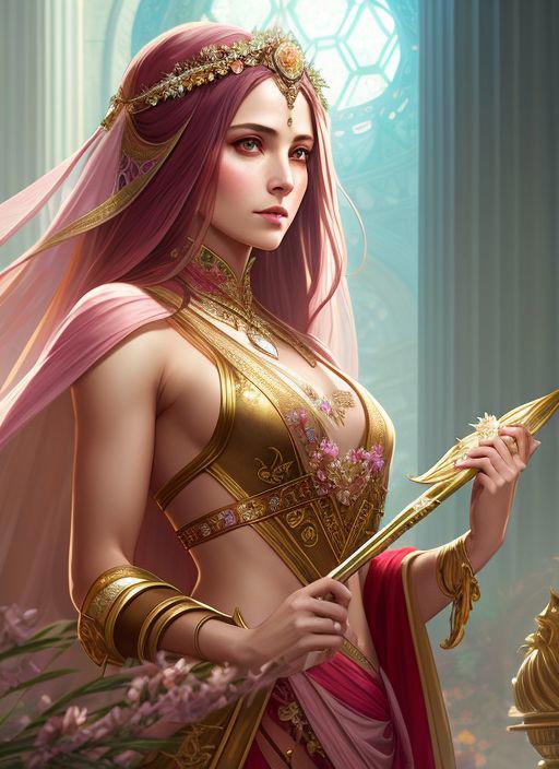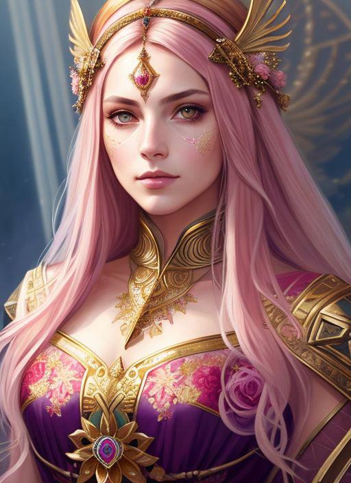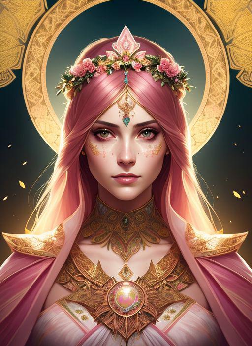 (symmetry:1.1) (portrait of floral:1.05) a woman as a beautiful goddess, (assassins creed style:0.8), pink and gold and opal color scheme, beautiful intricate filegrid facepaint, intricate, elegant, highly detailed, digital painting, artstation, concept art, smooth, sharp focus, illustration, art by greg rutkowski and alphonse mucha, 8k