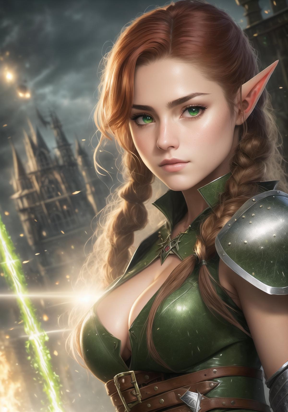 Masterpiece, best quality, realistic, style by Style-Skaven, 1girl, Shakira, with (twintails :1.2) red hair, as an (elf assassin:1.3), wearing (intricate leather armor:1.1), leather bodysuit, (leather boots:1.3), medieval, rogue, cleavage, (magical:1.1), (green magical explosion:1.3), fighting a huge rat monster, green electricity, green lightning, backlighting, (bloom:1.1), (light sparkles:1.2), (chromatic aberration:1.0), (shallow depth of field:1.2), looking at viewer, (dutch angle:1.0), sharp focus, perfect feminine face, (volumetric lighting:1.0), (detailed:1.0), (photorealistic:1.0), digital painting, (sharp:1), (realistic:1.0), cleavage