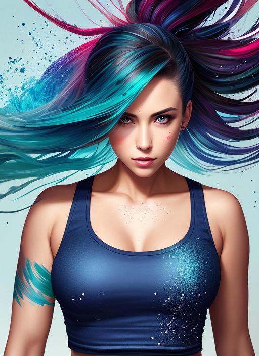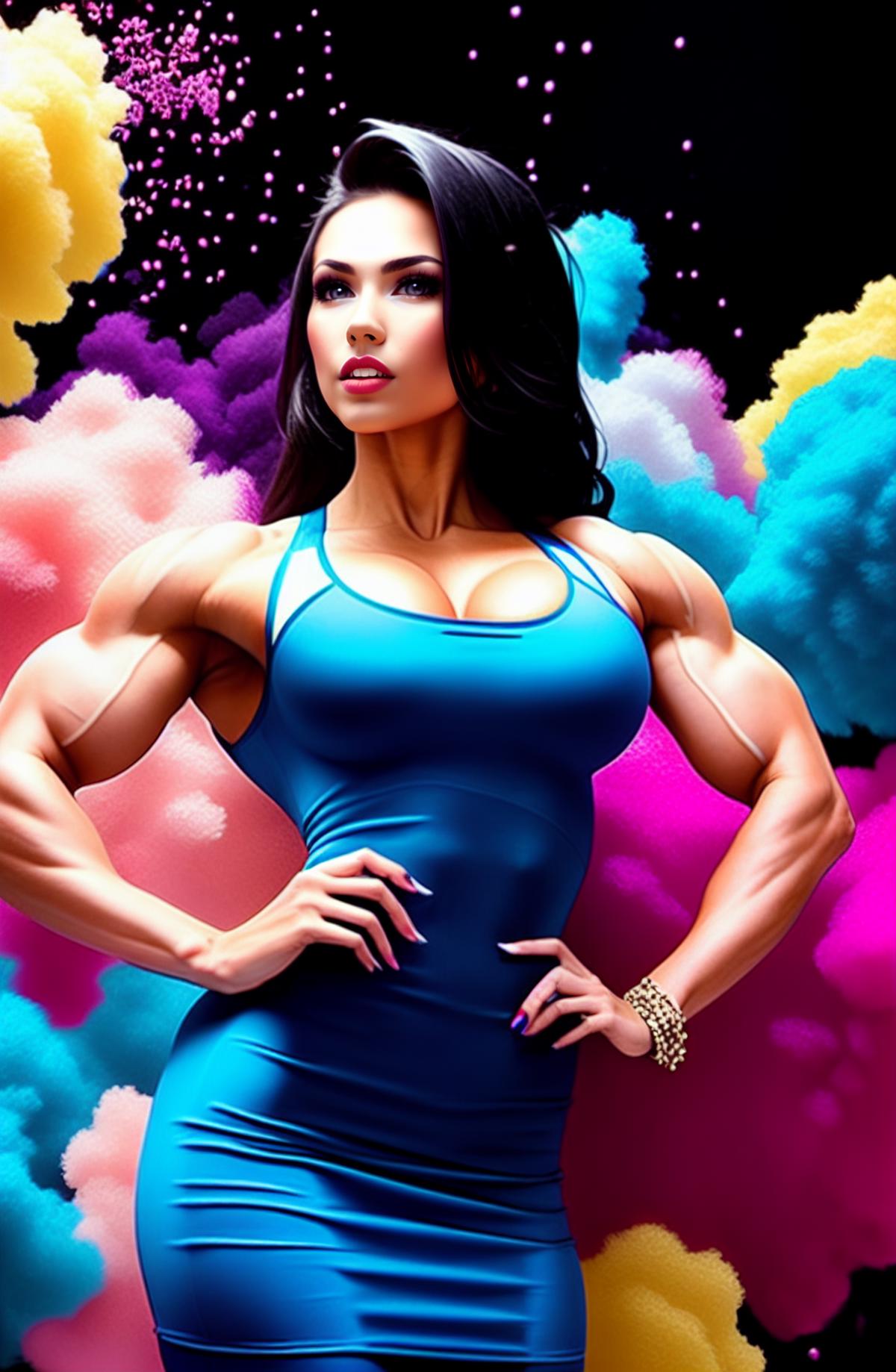 glamour photoshoot, gorgeous fitness model posing, elegant dress, vibrant colors, color splash, chalk explosions