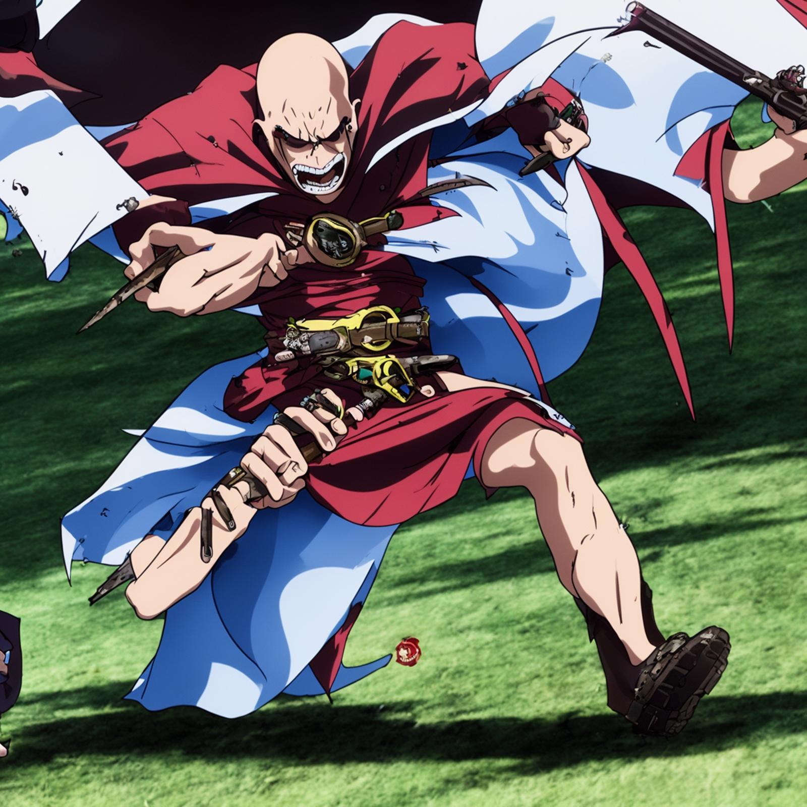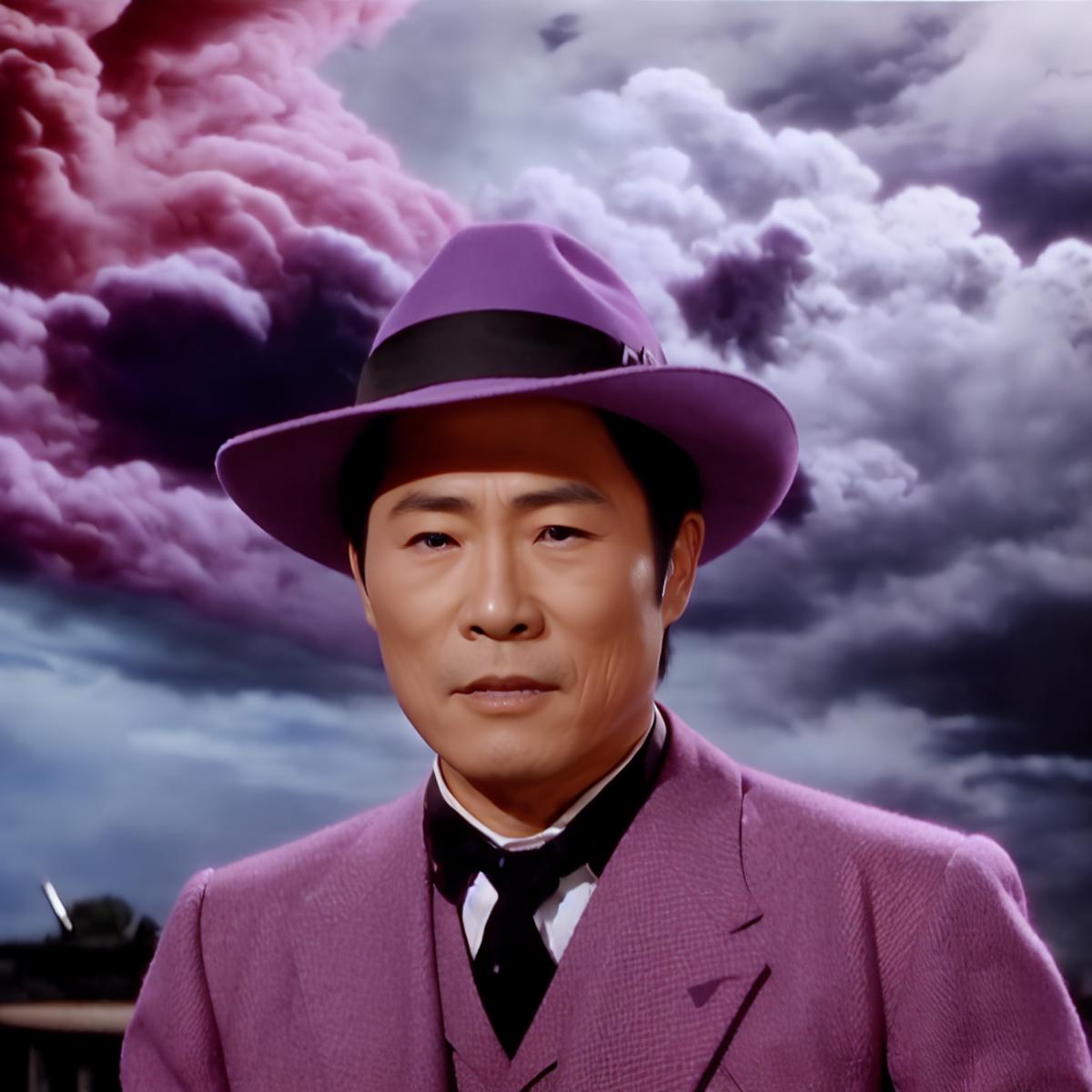 a japanese man wearing a purple suit and a black hat, with an fierce expression, with storm clouds in the background, tchnclr style