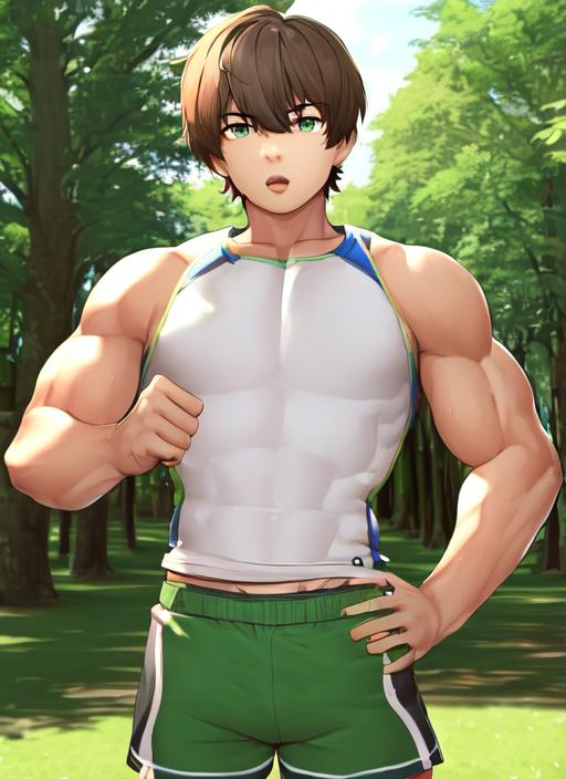 1boy, anatomy, upper body, solo, man, head, outdoors, shorts, fists, green eyes