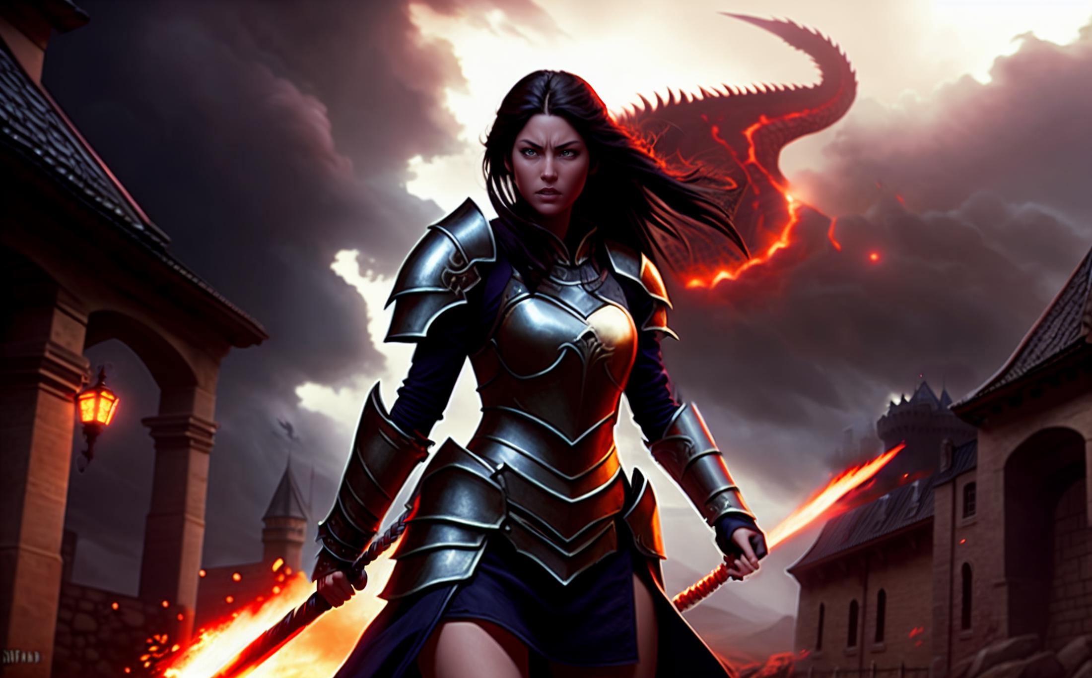action shot, gorgeous female paladin fighting by the castle gates, detailed intricate armor, elegant braided hair, angry, tense atmoshpere, dragon in the sky far in the background, mantra rendering by Raymond Swanland, cinematic, cinematic lighting, masterpiece