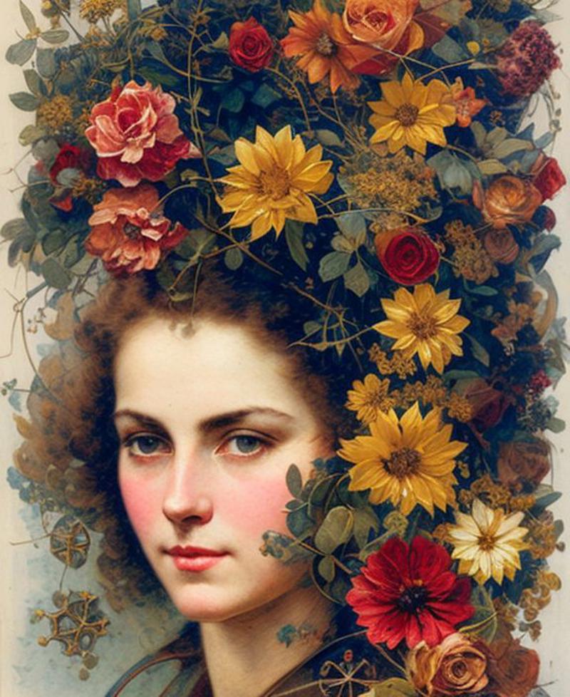 [Martin Ansin:Helen Allingham:0.4] realistic Lithography sketch portrait of a woman, flowers, [gears], pipes, dieselpunk, multi-colored ribbons, old paper texture, highly detailed