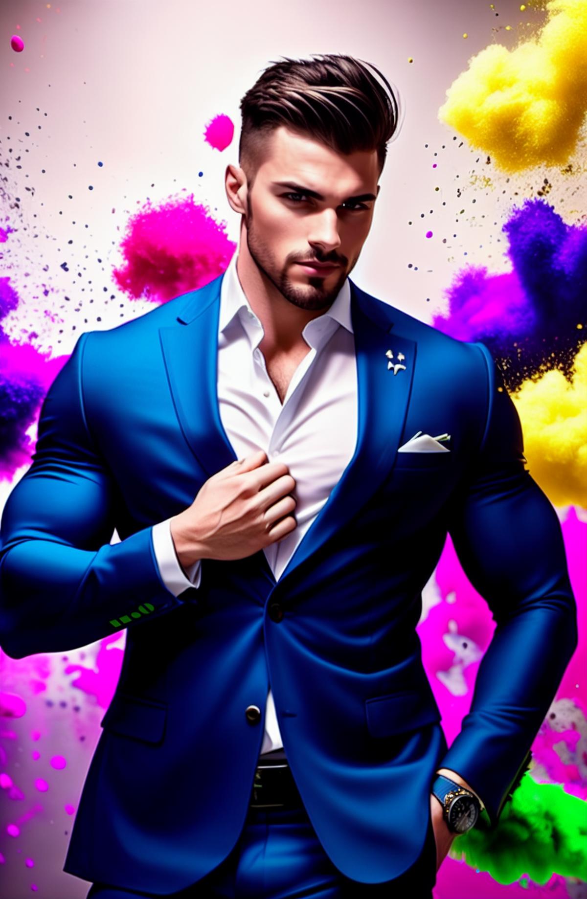 glamour photoshoot, rugged fitness model posing, trendy suit, vibrant colors, color splash, chalk explosions, professional photo, cinematic lighting, sharp focus