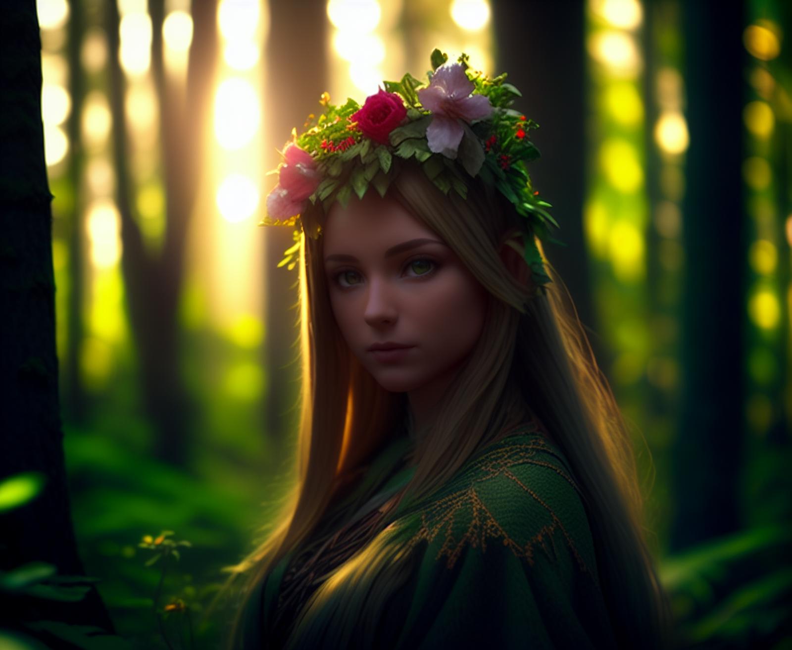 Masterpiece, best quality, 100mm, f/4, shutter speed 1/250, ISO 200, an elven goddess in a forest clearing, cinematic lighting, (backlighting:1.2), (bloom:1.2), (chromatic aberration:1.2), sharp focus