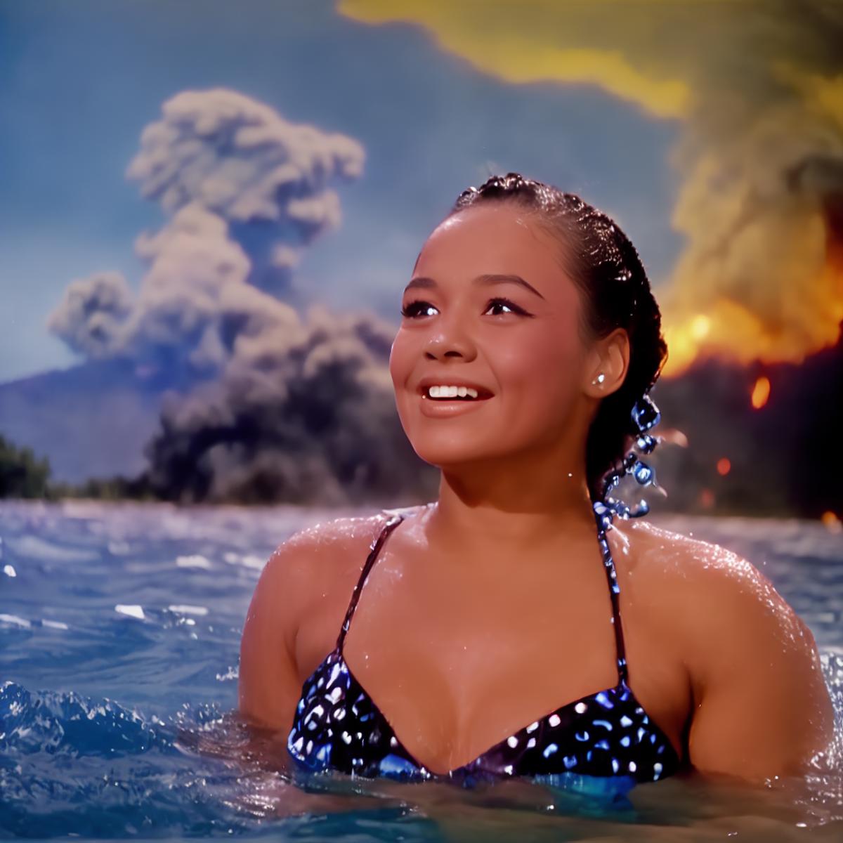 a smiling young [hawaiian|black] woman, swimming in blue water, wearing a bikini, looking up at the sky, (eyes and pupils:1.2), with a volcano (exploding fire:1.1) in the background, in the 1950s, tchnclr style