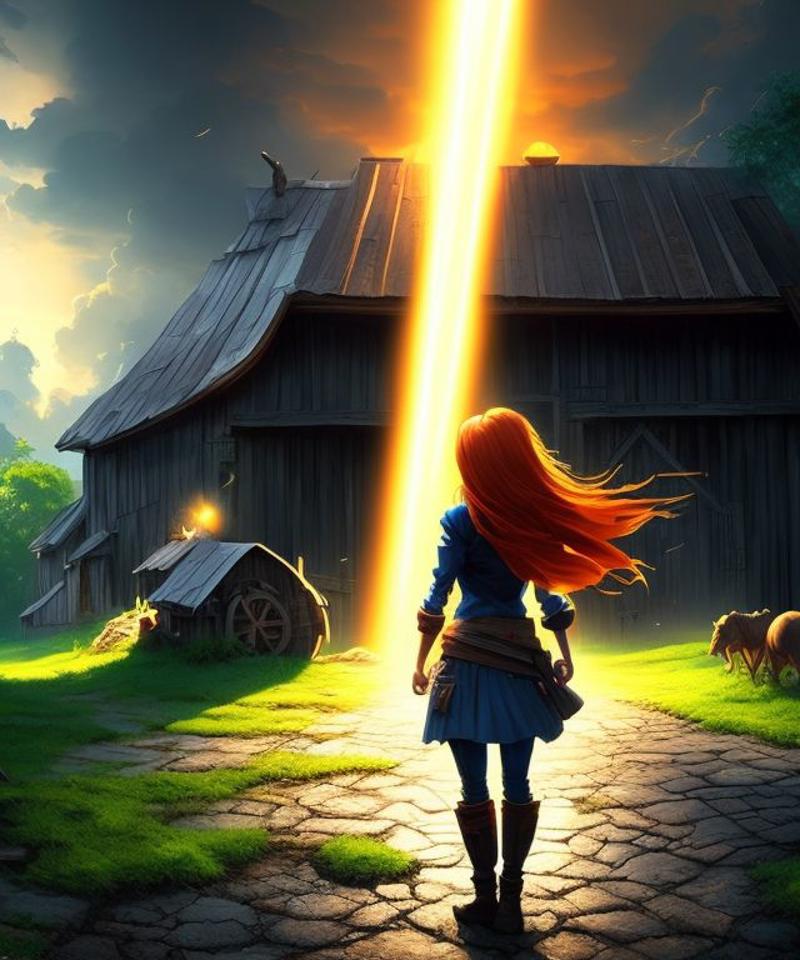 closeup of a young woman with auburn ahir standing in front of the barn at her farm, cute smirkm D&D, 3d liquid detailing fluid acrylic concept art in a foreest setting art by (animated) artgerm and greg rutkowski ((cel shading)) ((anime)) ((pixar)) Full of Light, Animated Film, Cinematography, Atmosphere, Highly Detailed Heavenly Dramatic Lighting, Highly Realistic Cinematic Lighting, Volumetric Lighting, Photography, Cinema, Epic High Dynamic Lighting, HDR