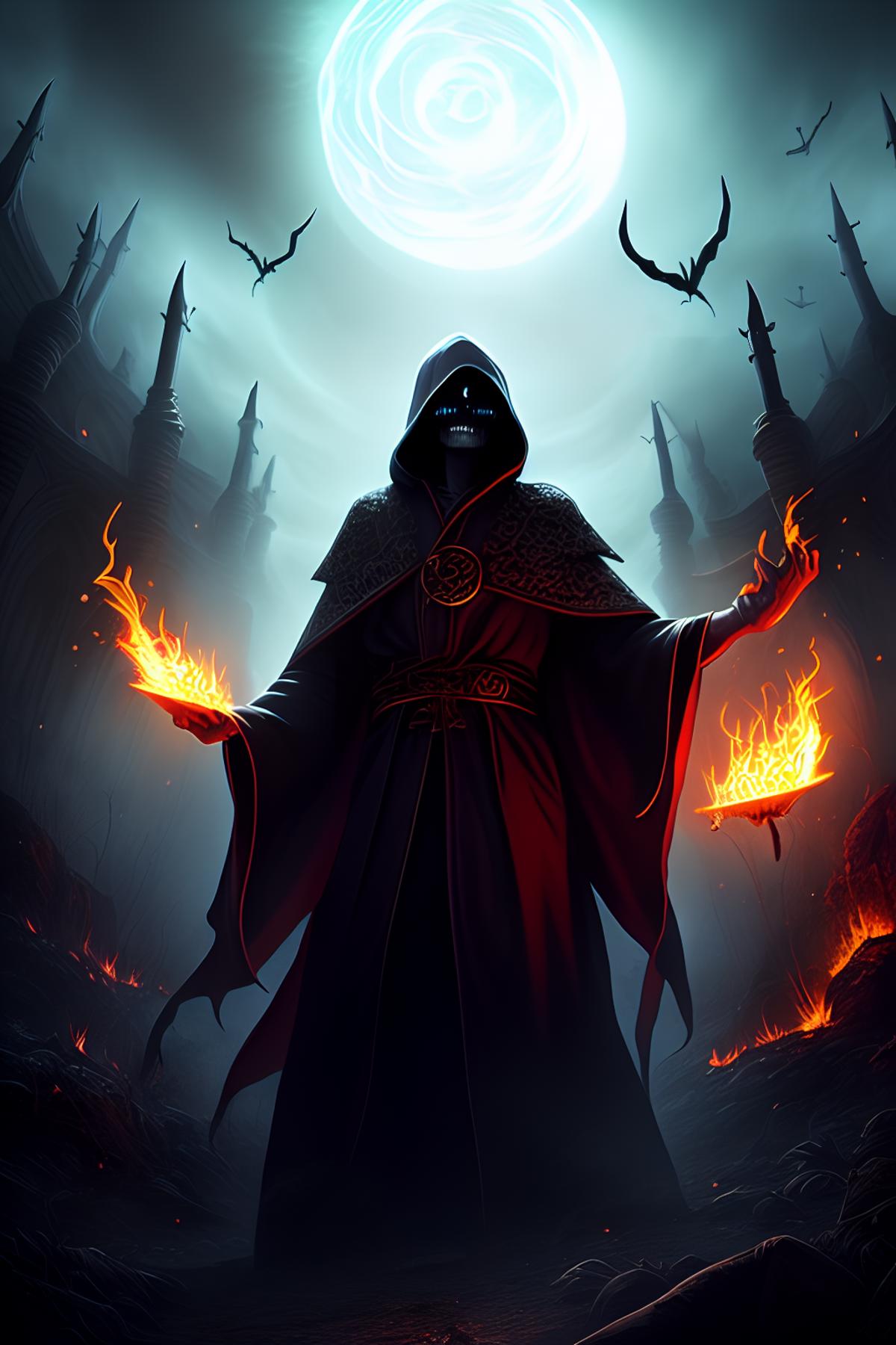 undead mage casting a powerful spell, burning eyes, fire, lightning, death, bones, ghouls, intricate robe, ominous atmosphere, karma rendering, masterpiece, fantasy art