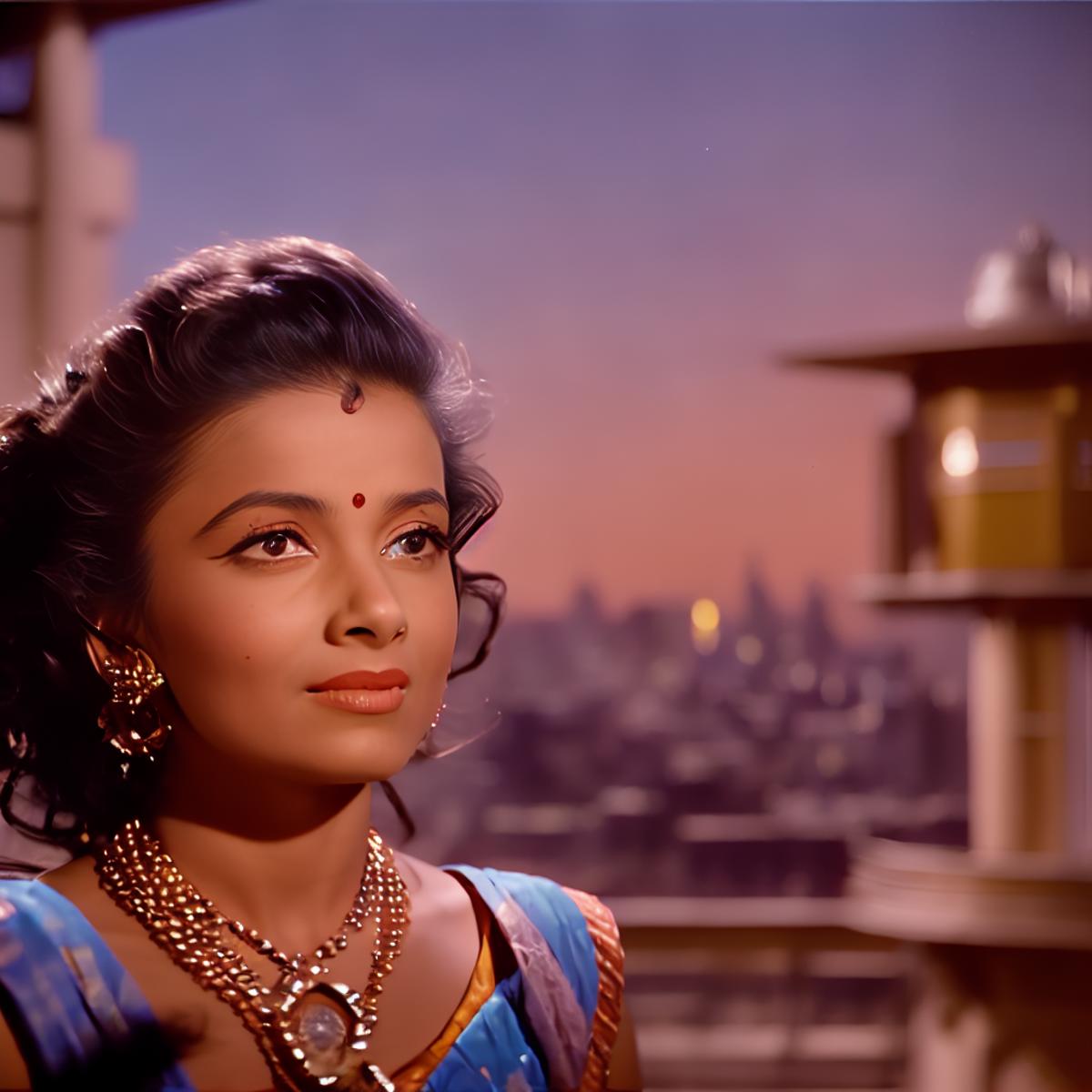 closeup of an indian girl on a rooftop, with long flowing (windswept hair:1.3), with glowing city windows in the background, at night, (1950s:1.2) color photo, tchnclr