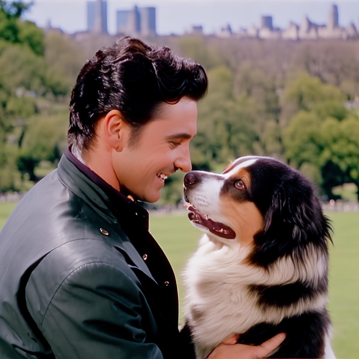 a (closeup:1.3) profile view of a sultry man with short black hair and a smiling border collie in love, with central park in the background, in spring, tchnclr