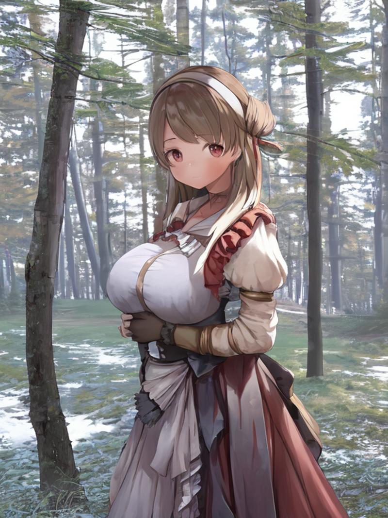 1girl, outside, woods, waist, upper body, realistic, breasts
