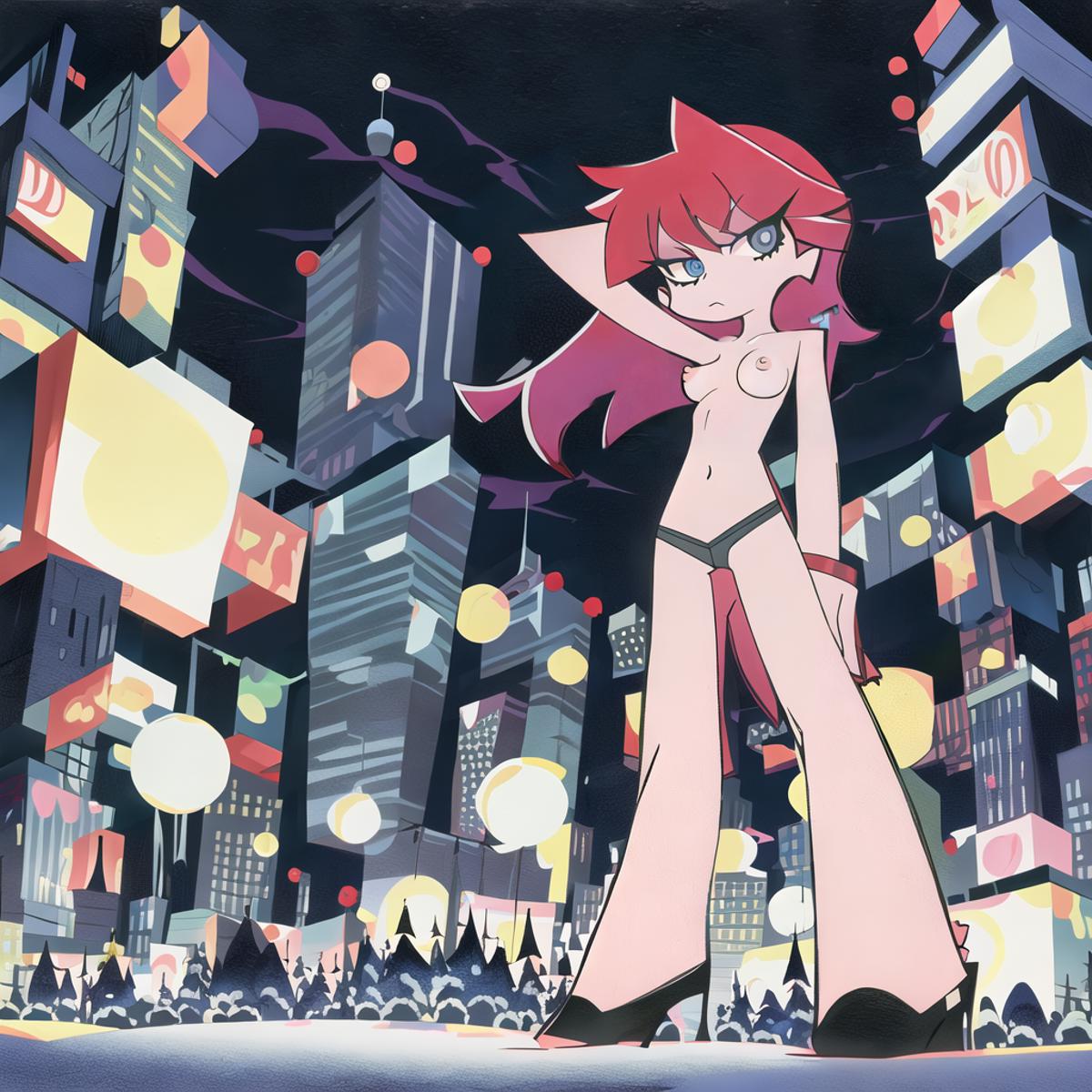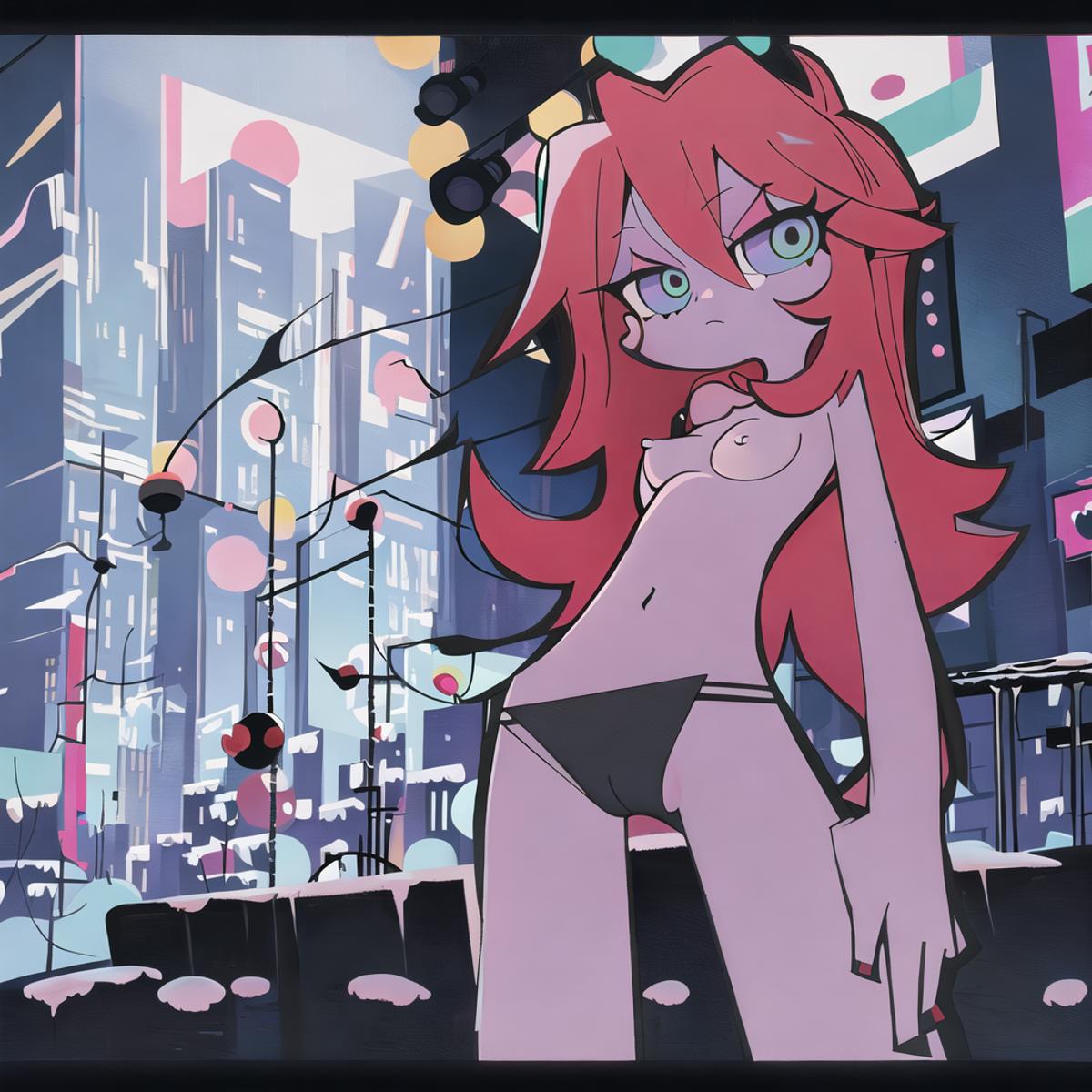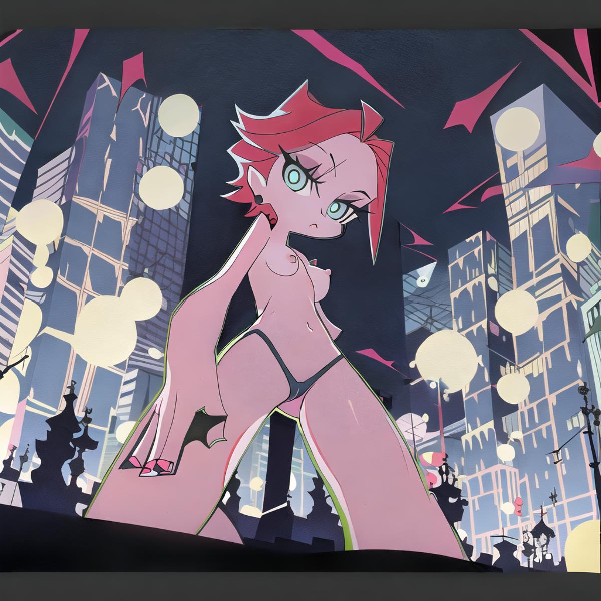 a catoon painting of a girl with red hair posing in front of a cyberpunk city, (1girl), pansto art style, nude, black panties, solo, nipples, small breasts,