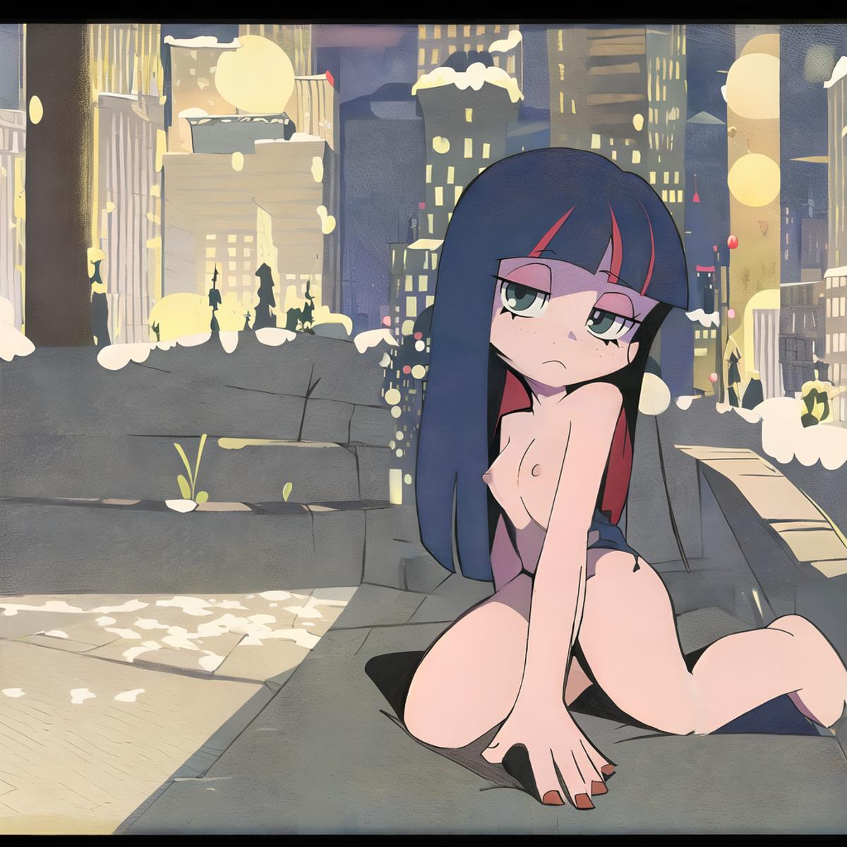 (solo), masterpiece, best quality, no panties, looking at viewer, (1girl), nude, pansto art style, city backgroung, small breasts, long hair, nipple