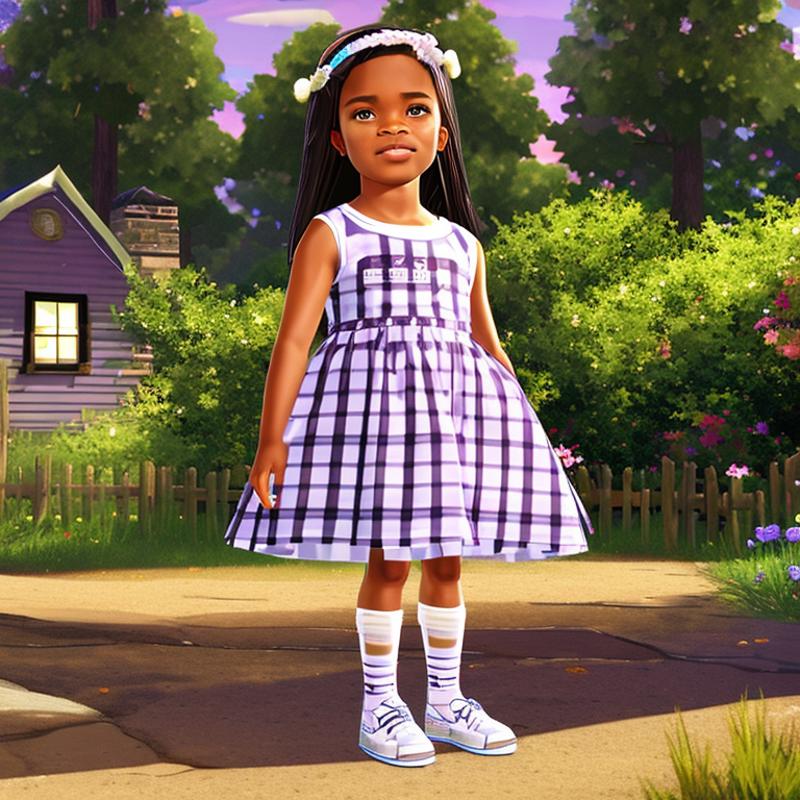 a photograph of a little black toddler girl with long intricate braided black hair and a checker patterned sunday church dress and shiny black shoes on her feet, in front of a cute little church in the countryside, clear face gta768