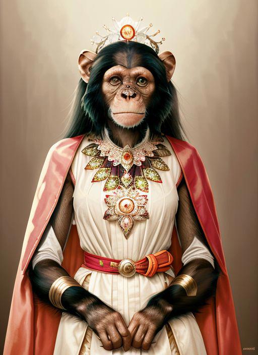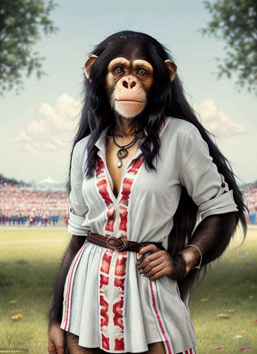 photorealistic painting ((full body)) portrait of ((stunningly attractive)) a chimp woman at a music festival, ((perfect feminine face)), (+long colorful wavy hair), (+glitter freckles), glitter, wearing a dress, intricate, 8k, highly detailed, volumetric lighting, digital painting, intense, sharp focus, art by artgerm and rutkowski and alphonse mucha, cgsociety