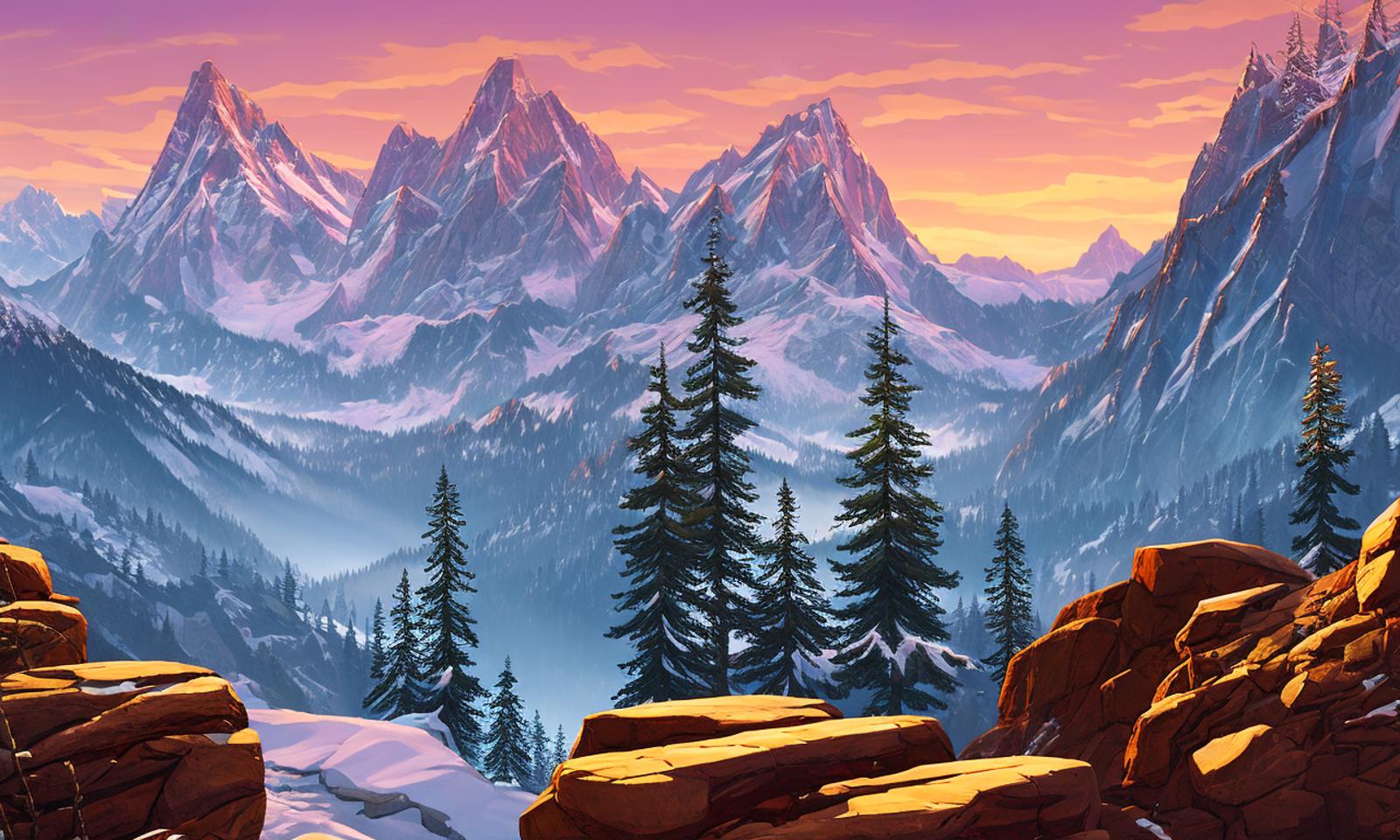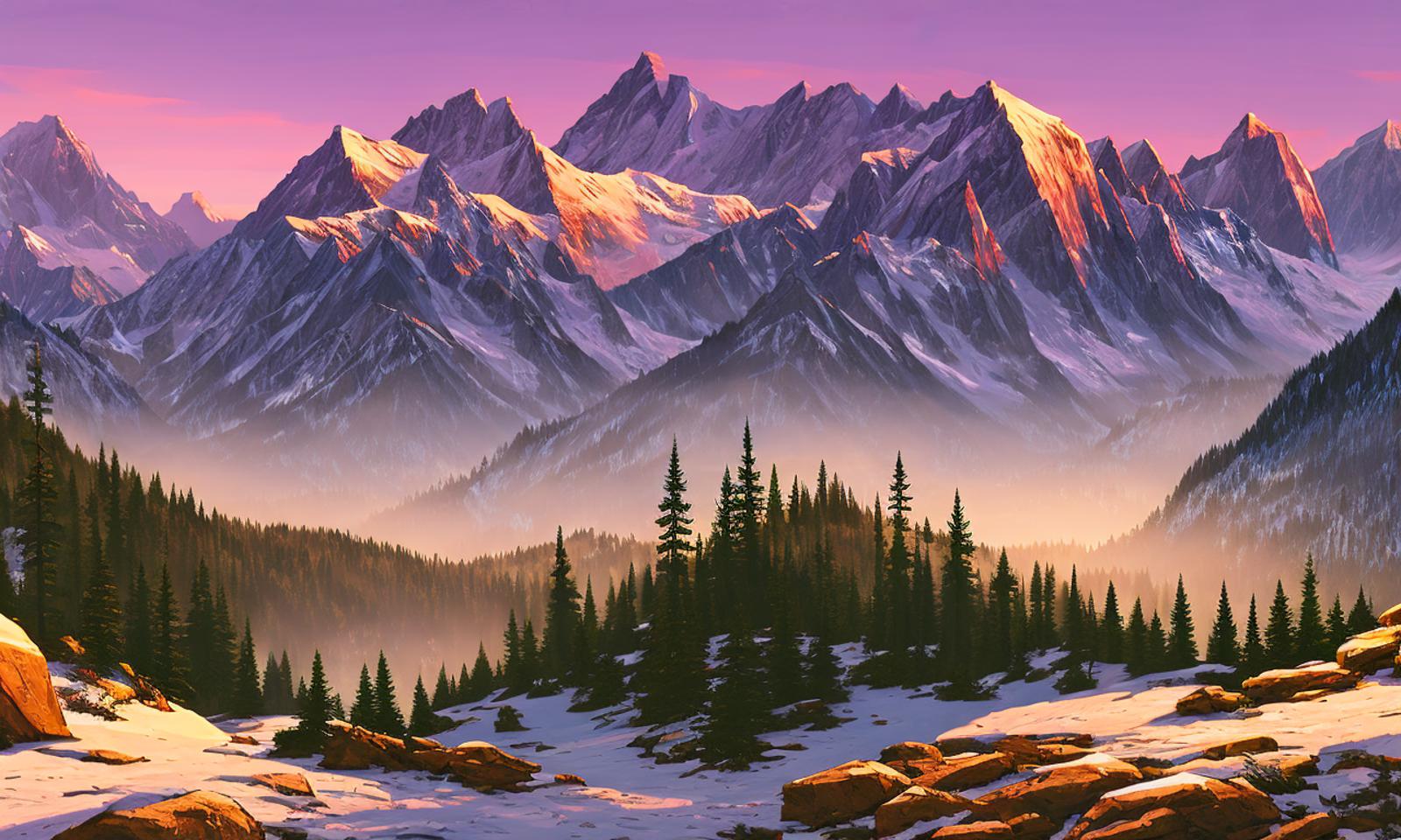a landscape painting of dawn over the rocky mountain cliffs in the winter gta768