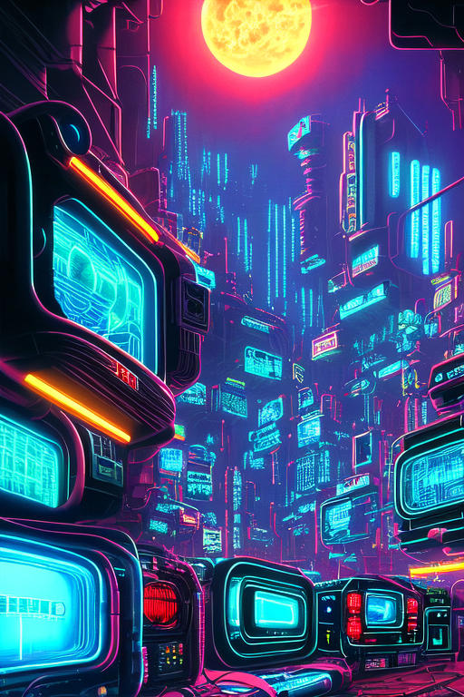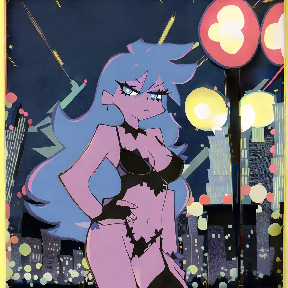 a cartoon of a woman in lingerie posing for a picture with a neon background and a city skyline with blue streaks in hair,