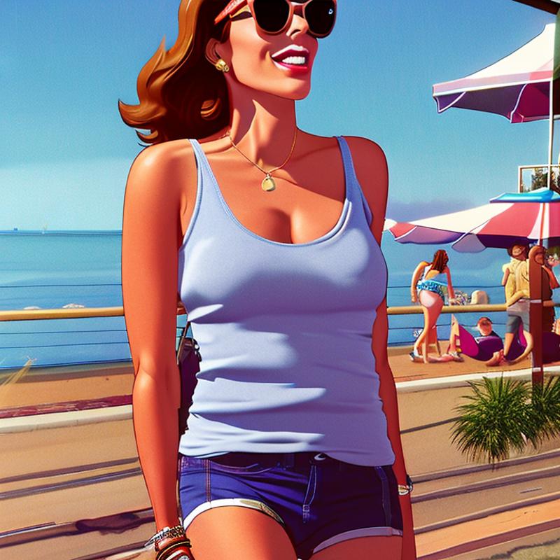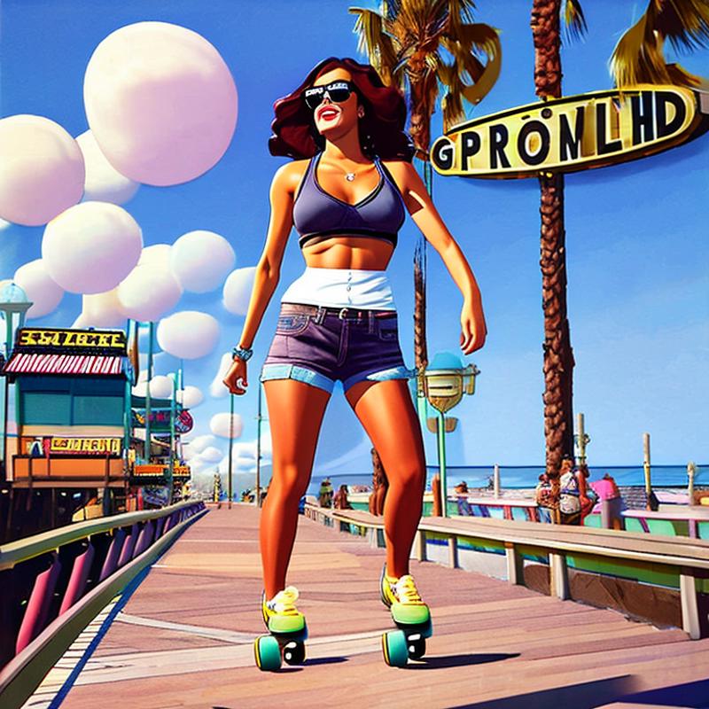 a sexy woman wearing roller skates on her feet and is blowing a bubble gum bubble out of her mouth and is wearing big sunglasses on her face and is walking on the Jersey Shore boardwalk, summertime circa 1978 gta768