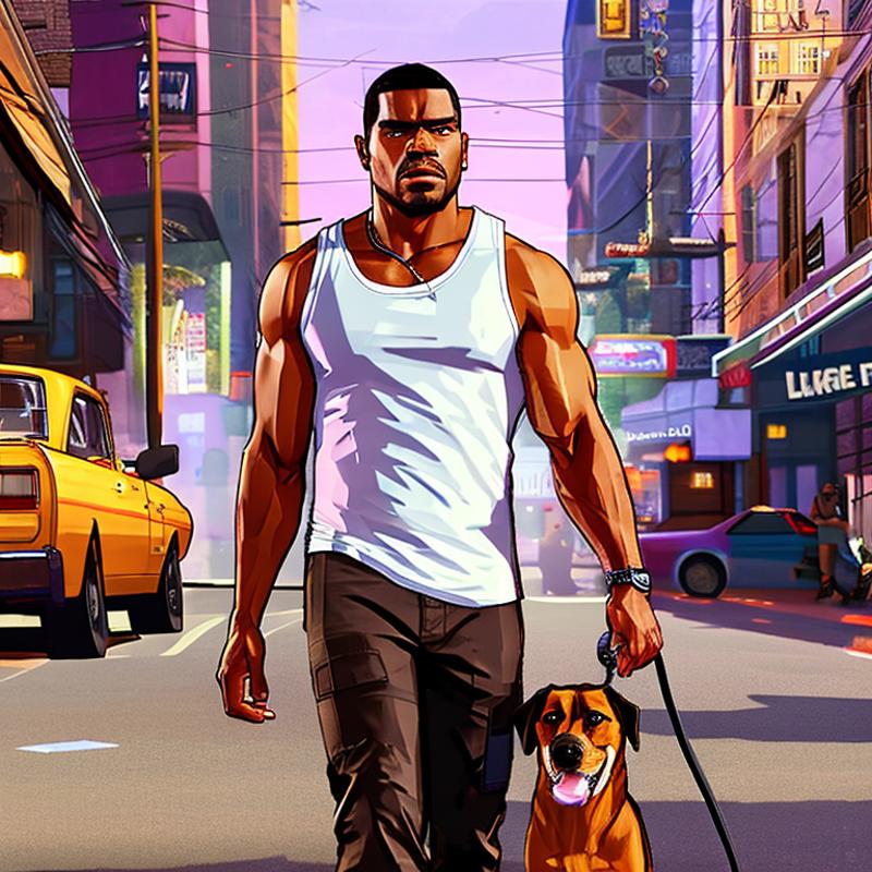 a big strong black man wearing a dirty white wife-beater shirt and is walking his Rottweiler on a leash in downtown San Francisco gta768