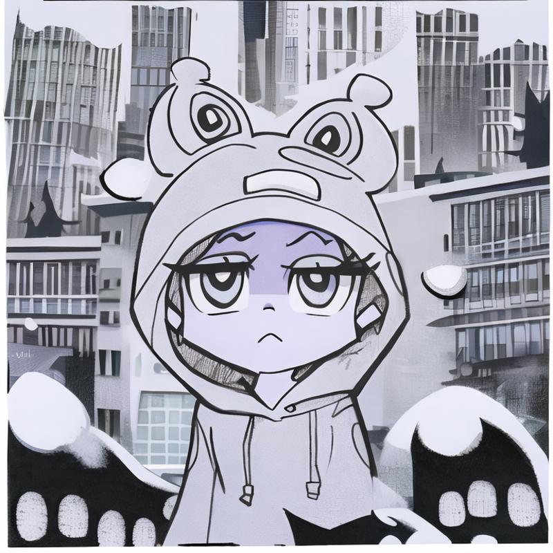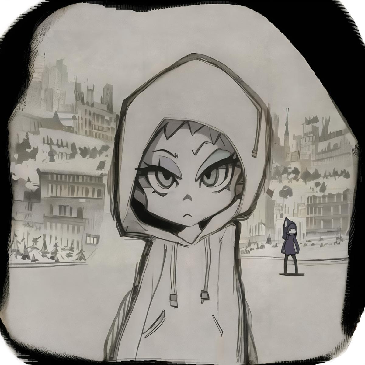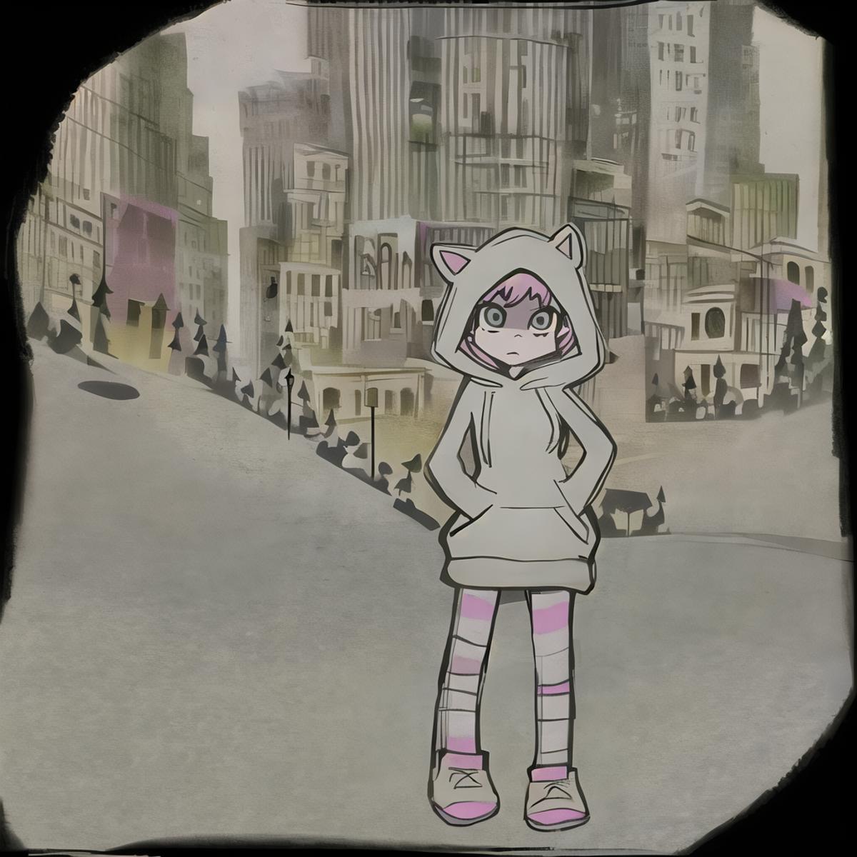 a cartoon drawing of a girl in front of a city in a hoodie close up, pansto art style,