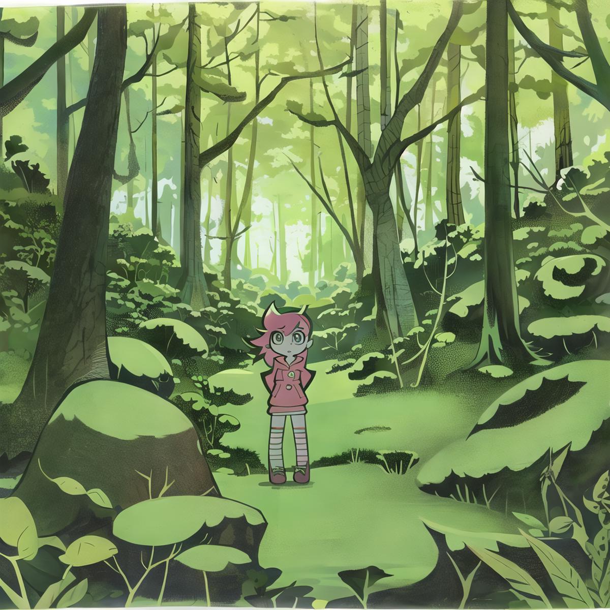 a cartoon drawing of a girl in front of a forest, pansto art style,
