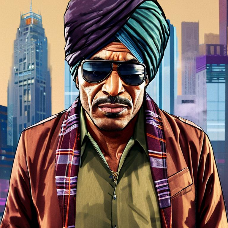 a gruff looking indian man in a turban holding a gun in the city gta768