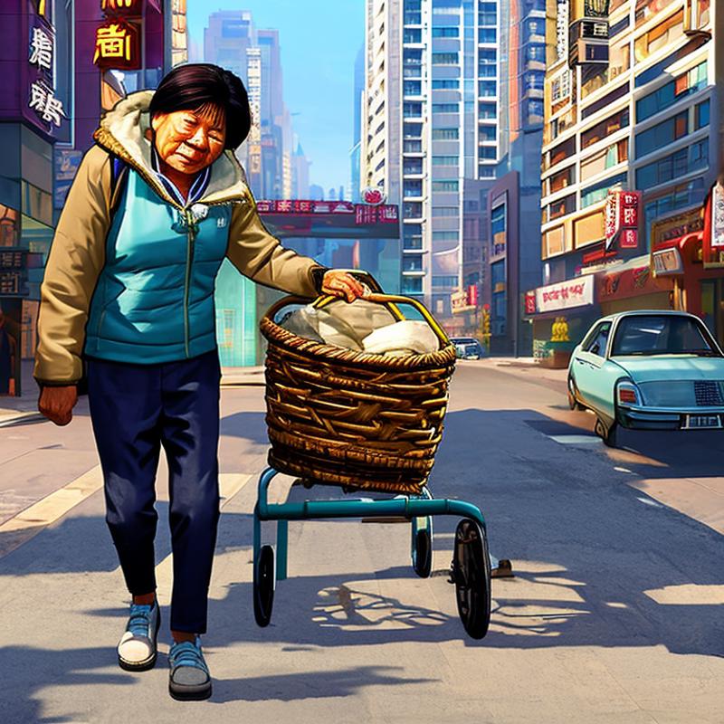a close up photograph of n old Chinese woman pushing a hand cart through the streets of Beijing, clear face gta768