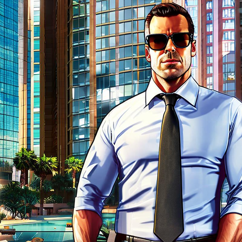 a gruff looking business man in a wearing sunglasses in a high rise building gta768