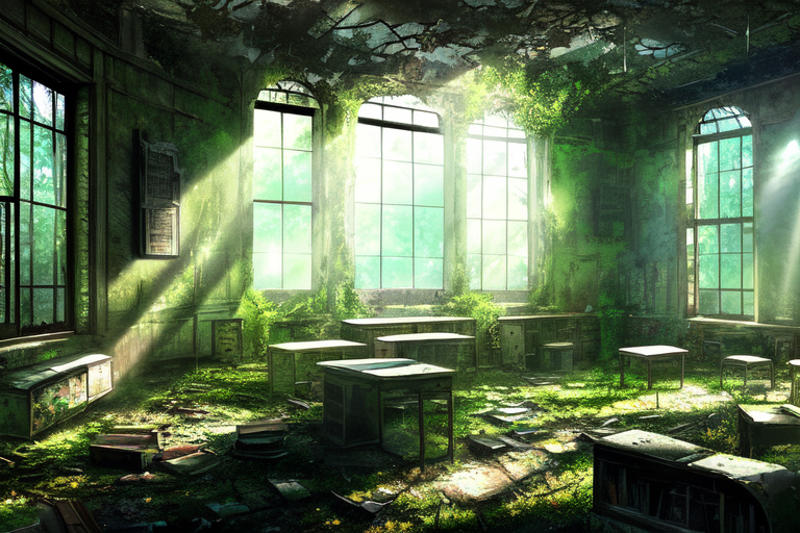 wallpaper, a ruined (mossy:0.8) classroom, anime art, volumetric fog, fantasy, fantastic style, beam of light from window, cracked blackboard, deserted, old