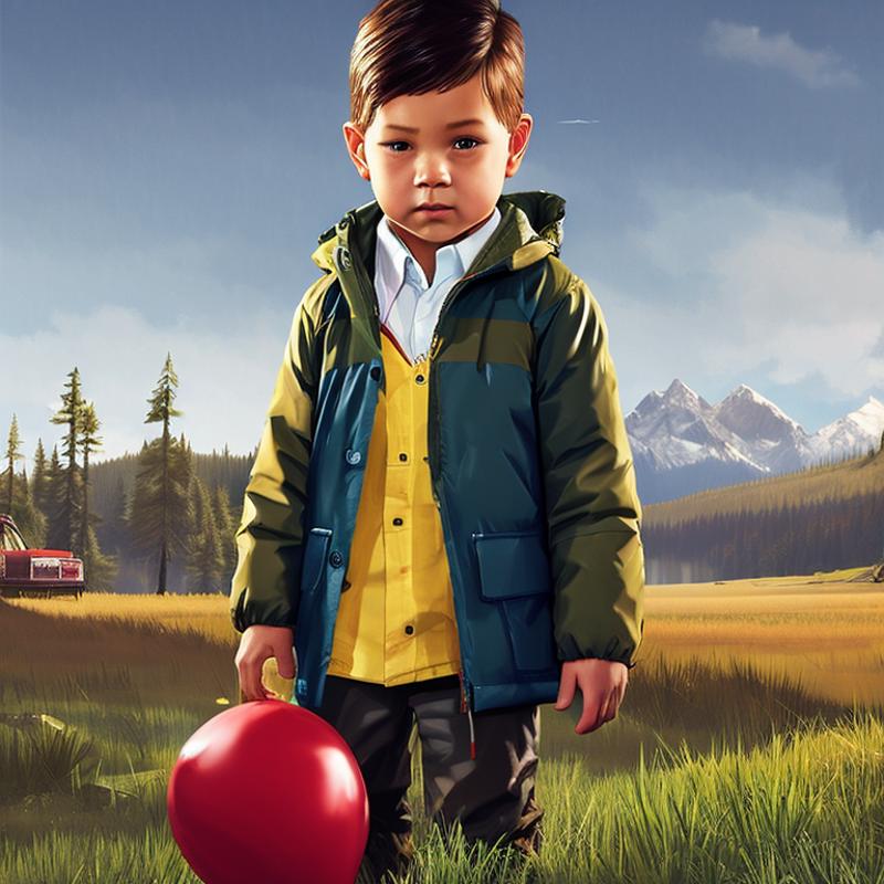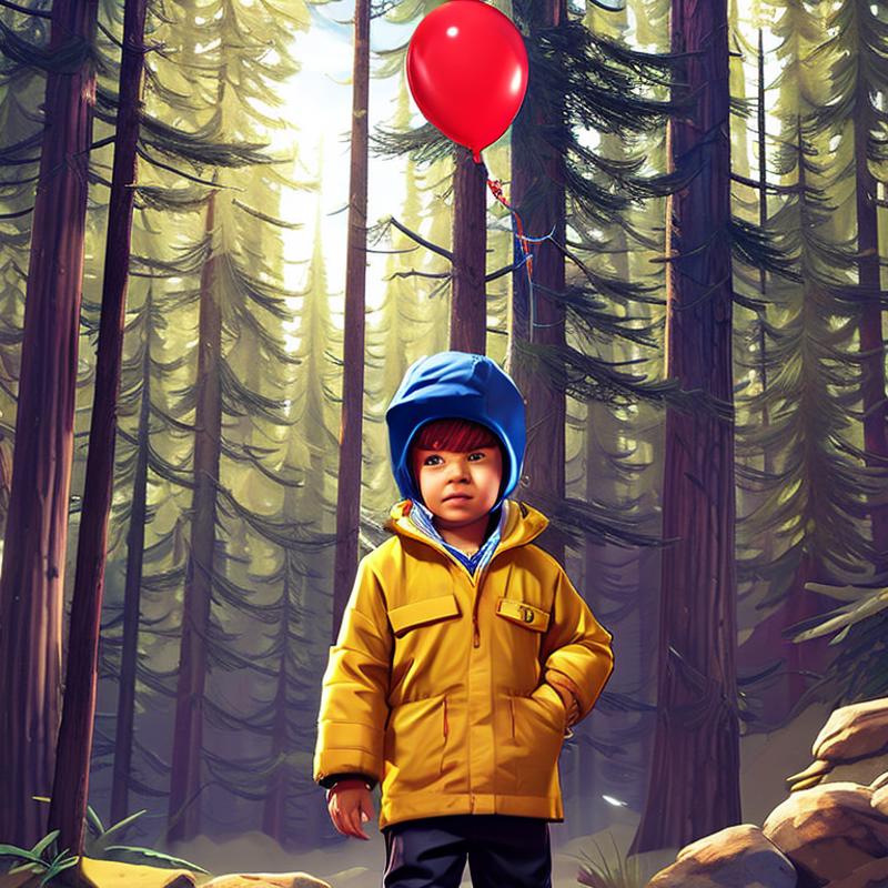 a little boy wearing a yellow raincoat and is holding a string tied to a floating red balloon and is standing in the wilderness , clear face gta768