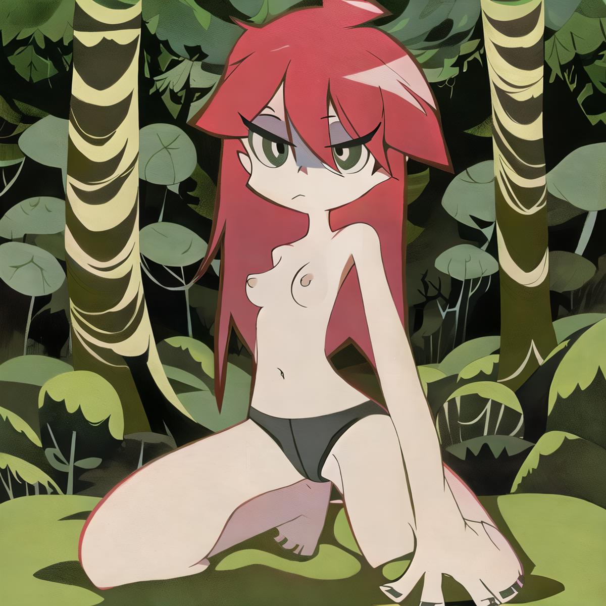 a cartoon drawing of a girl with red hair in front of a forest wearing black panties, (1girl), pansto art style, nude, panties, solo, nipples, teen