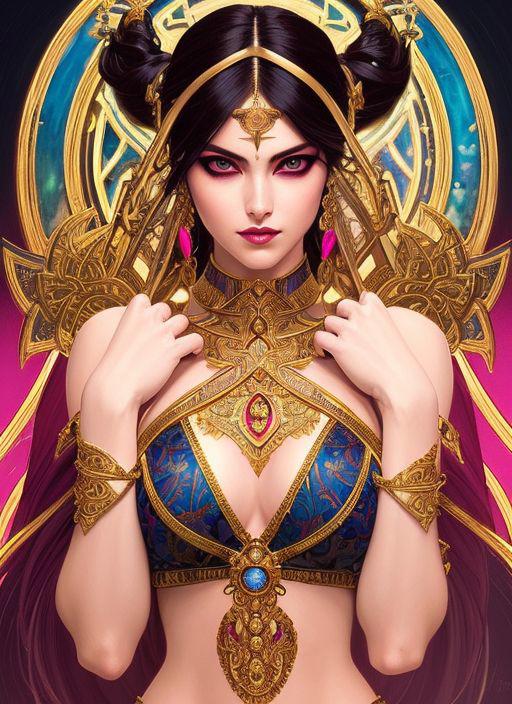 style of joemadureira (nvinkpunk:1.3) (snthwve style:1.4) (symmetry:1.1) (portrait of floral:1.05) a woman as a beautiful goddess, (assassins creed style:0.8), pink and gold and opal color scheme, beautiful intricate filegrid facepaint, intricate, elegant, highly detailed, digital painting, artstation, concept art, smooth, sharp focus, illustration, art by greg rutkowski and alphonse mucha, 8k