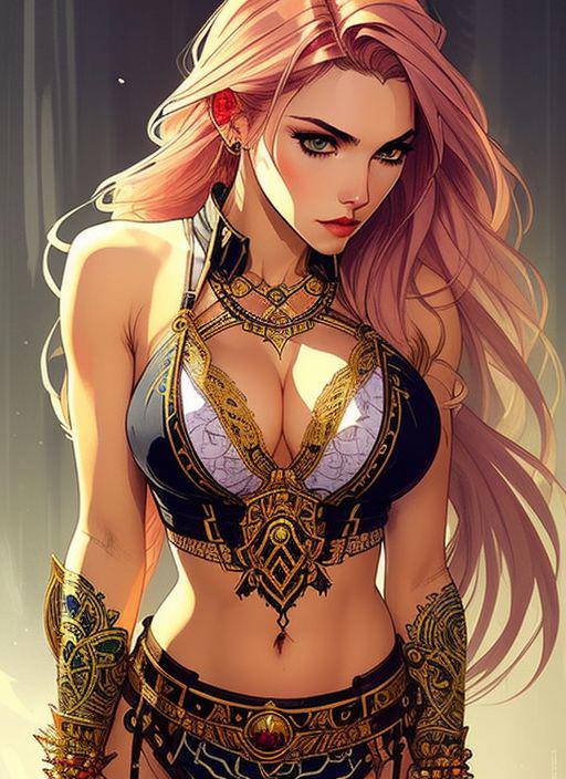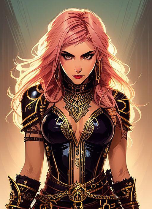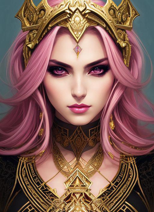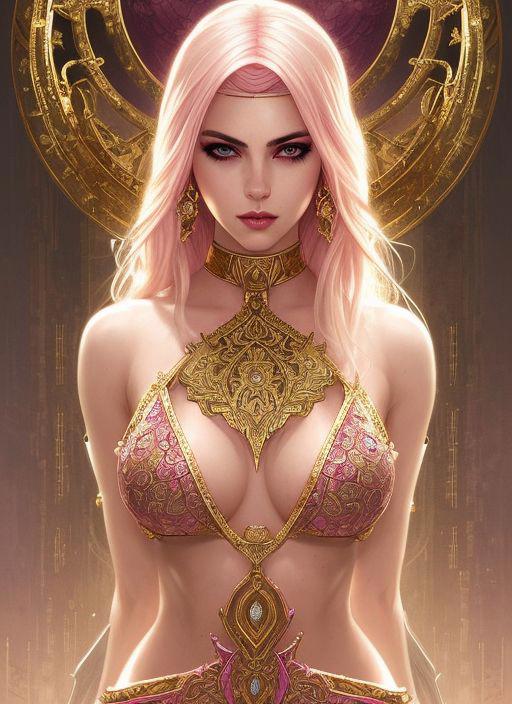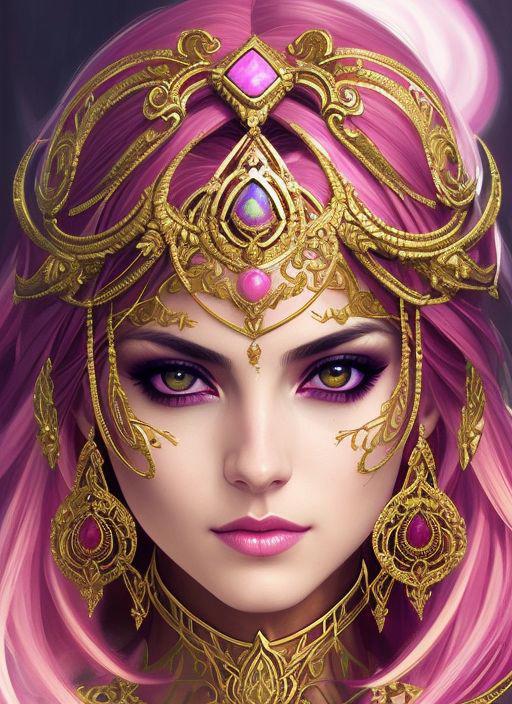 style of joemadureira (symmetry:1.1) (portrait of floral:1.05) a woman as a beautiful goddess, (assassins creed style:0.8), pink and gold and opal color scheme, beautiful intricate filegrid facepaint, intricate, elegant, highly detailed, digital painting, artstation, concept art, smooth, sharp focus, illustration, art by greg rutkowski and alphonse mucha, 8k