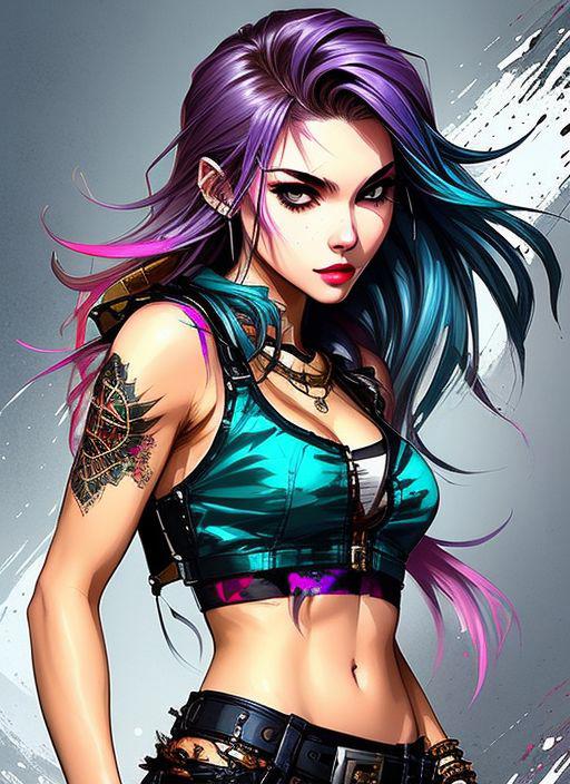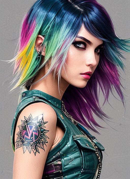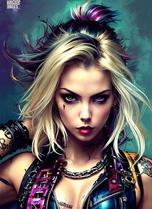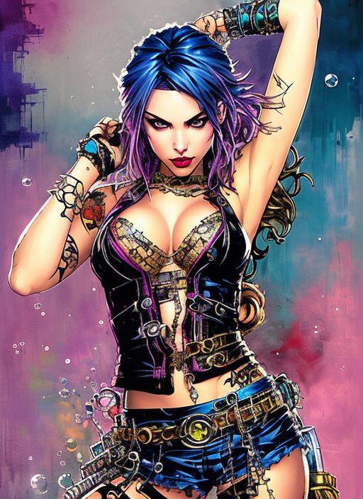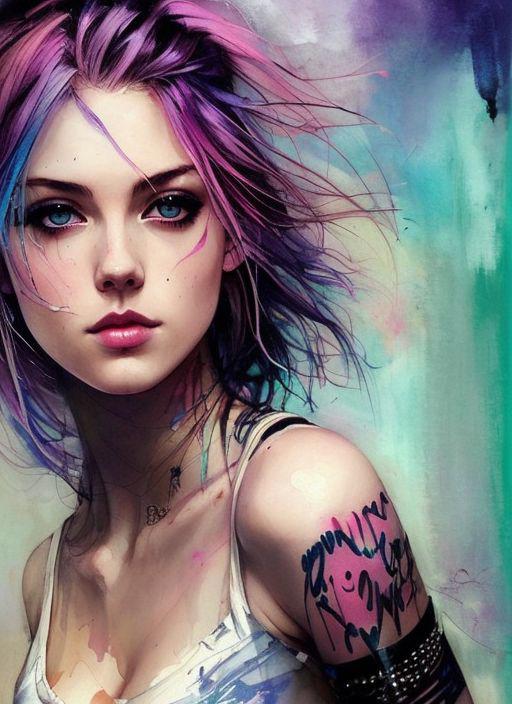 style of joemadureira (nvinkpunk:1.3) (snthwve style:1.4) drunken beautiful woman as delirium from sandman, (hallucinating colorful soap bubbles), by jeremy mann, by sandra chevrier, by dave mckean and richard avedon and maciej kuciara, punk rock, tank girl, high detailed, 8