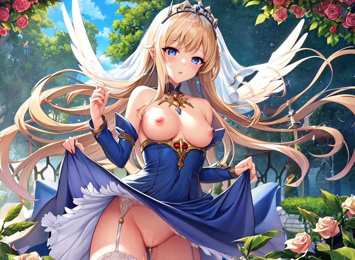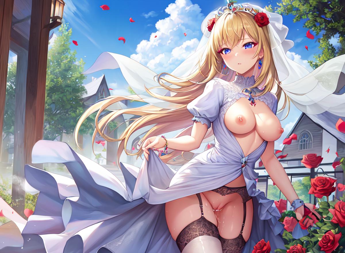 nsfw, masterpiece, best quality, a beautiful award winning (drawing by ) of a medium breast nude girl sitting on a rock in a stream, wet shiny skin, nipples, vagina, clitoris, dynamic shading, soft lighting, full color, field of roses, curvaceous body, blonde braided updo, perfect face, face, godrays, spread legs, face, detailed face,